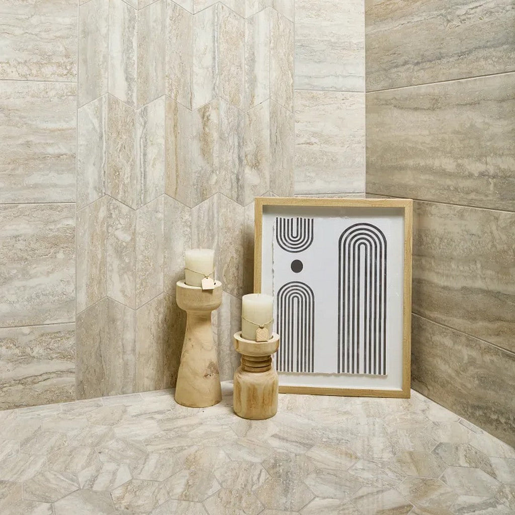Arizona Tile Invictus Vein Cut 12x24 Polished Rectified Porcelain Tile delivers refined luxury with a glossy sheen. The detailed veining enhances interiors with a premium, marble-like touch.