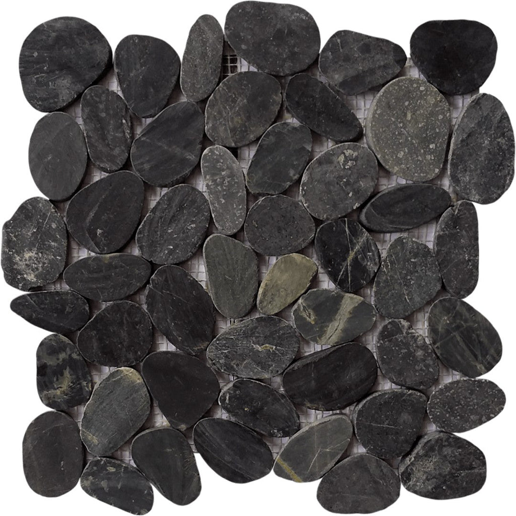 Bati Orient USA Bali 12" x 12" Sliced XL Pebble Natural Stone Mosaic is a striking statement piece, showcasing oversized, flattened Sliced XL Pebble shapes in a natural stone mosaic, creating a commanding and textural 12x12 sheet for both wall and floor designs.