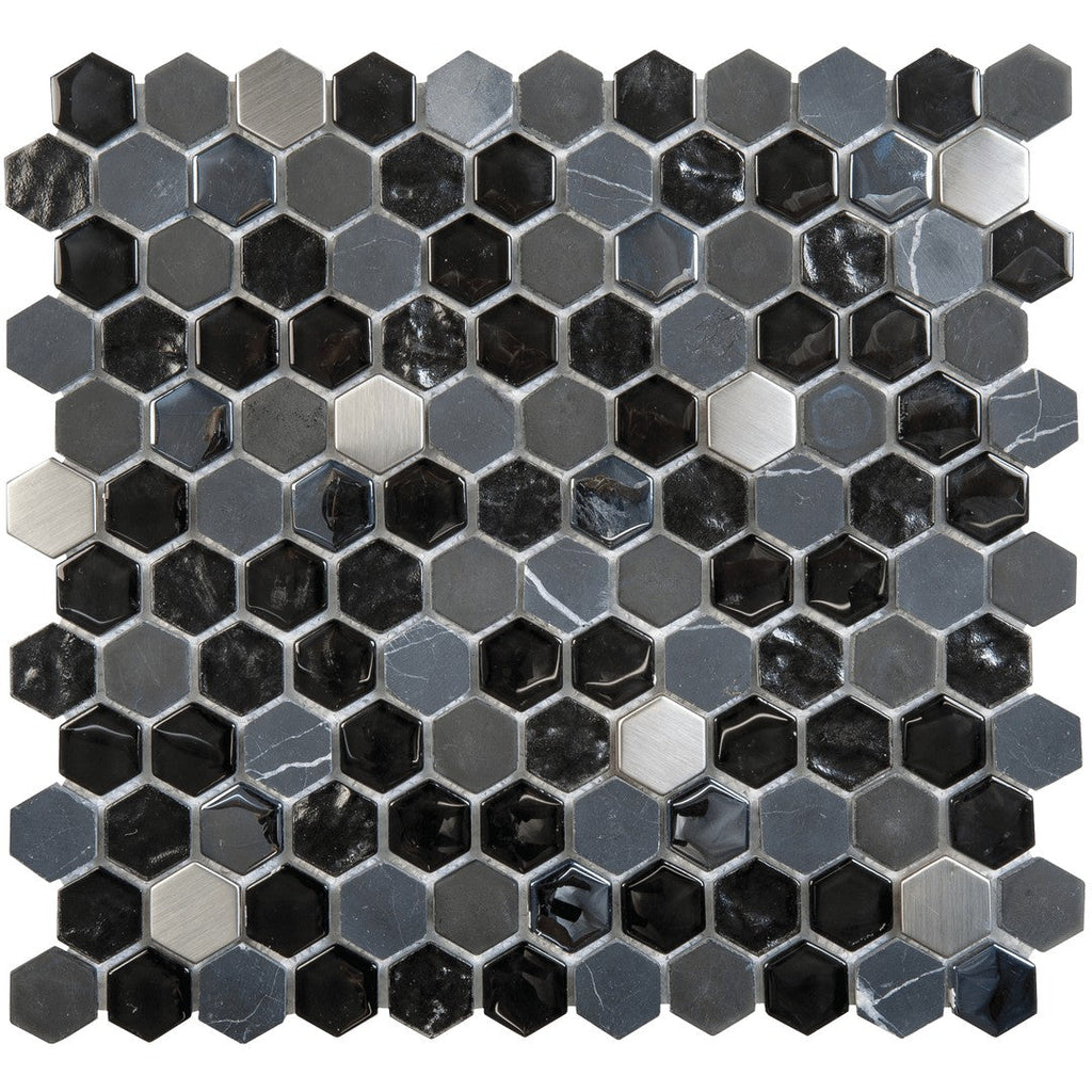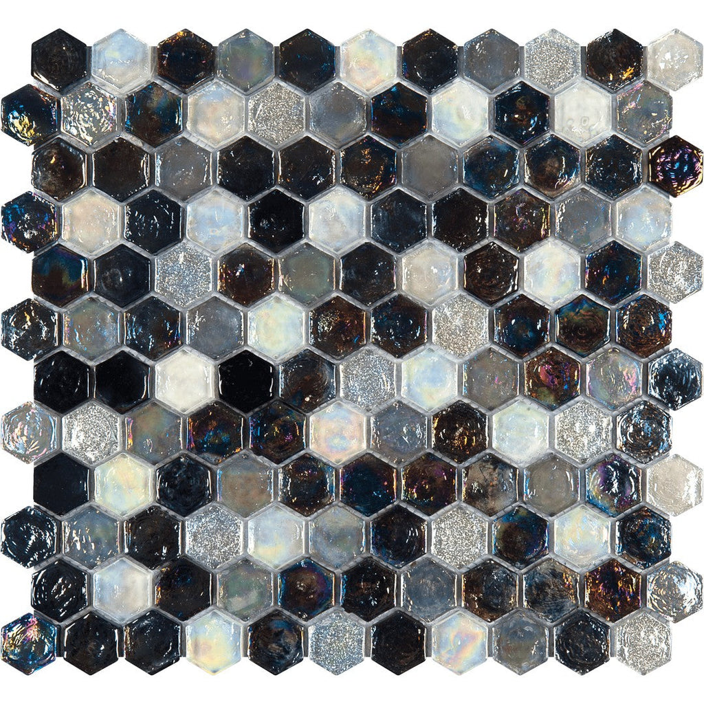 Bati Orient USA Terrazzo 12" x 12" Hexagon Glass Mosaic features a classic hexagon shape in a uniform, all-glass design, perfect for adding clean lines and reflectivity. This elegant glass hexagon mosaic is a versatile option for showers and kitchens. Shop Bati Orient USA pure glass hexagon tiles.