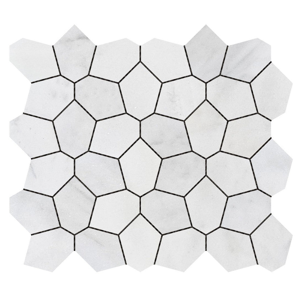 Bati Orient USA White & Grey Marble Classic 9.7" x 11" Interlocking Irregular Hexagon Mosaic offers a unique twist on the popular hexagon, featuring irregularly sized hexagons in a seamless interlocking pattern of white and grey marble. This artistic Irregular Hexagon Mosaic is perfect for creating a sophisticated, organic feel with its varied geometry. Embrace the modern asymmetry of this Bati Orient USA Irregular Hex Tile.