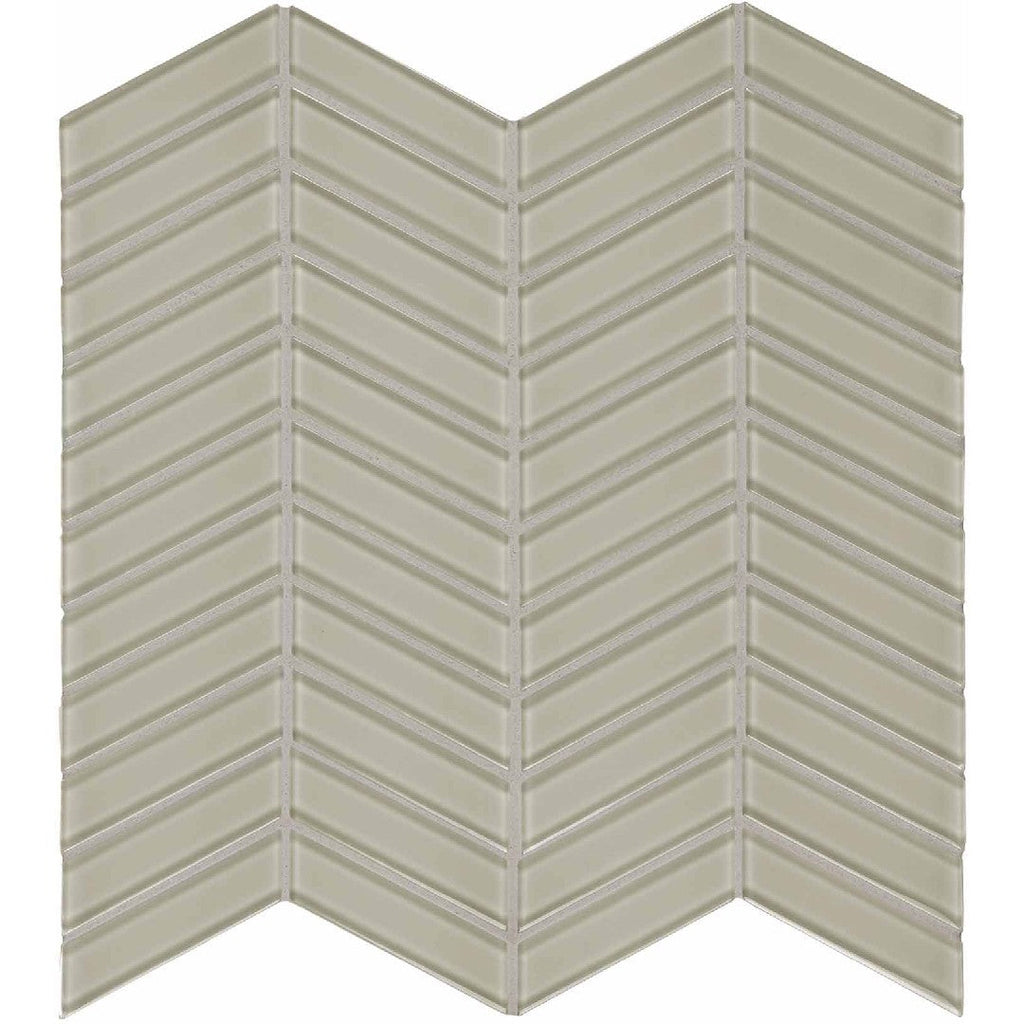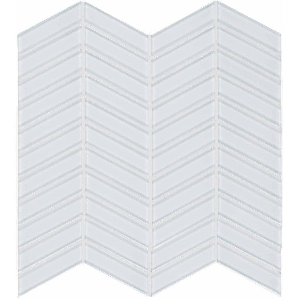 Crossville Elements Glass Posh 12x12 Gloss Glass Chevron Mosaic creates dynamic movement with its angled pattern. The polished glass enhances spaces with modern vibrancy and eye-catching geometric appeal.