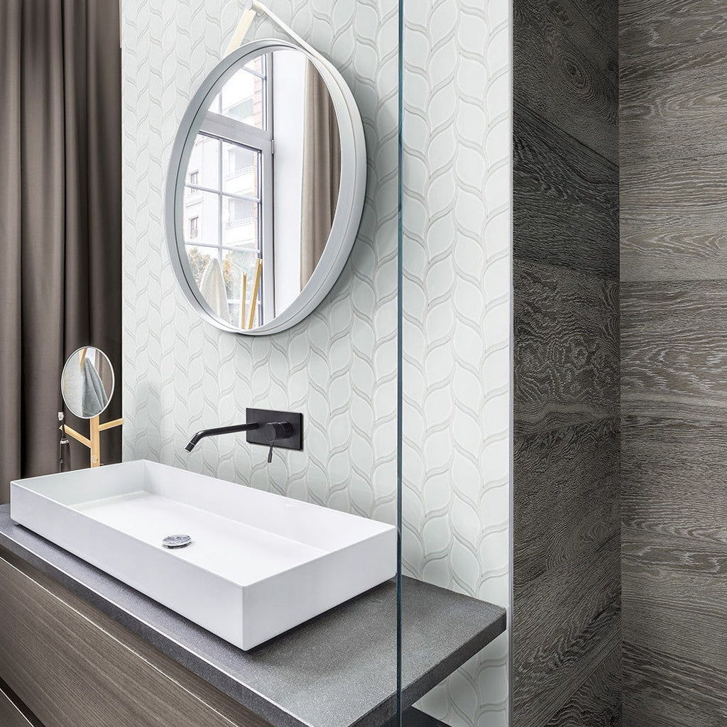 Crossville Elements Glass Posh 12x12 Gloss Glass Petal Mosaic adds soft, floral-inspired curves for a decorative touch. The luminous glass finish elevates spaces with elegance and artistic beauty.