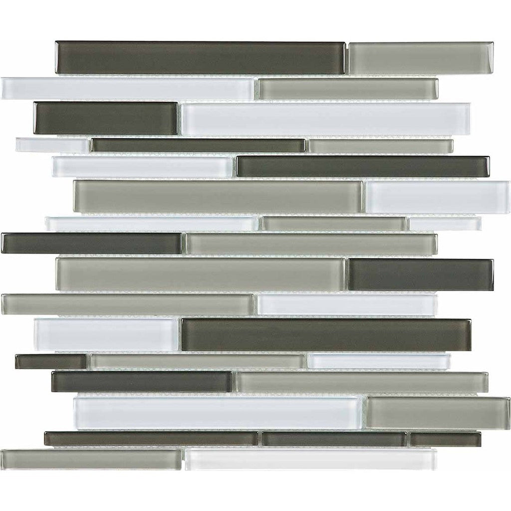 Crossville Elements Glass Posh 12x15 Gloss Glass Random Linear Blend Mosaic blends mixed lengths and tones for a contemporary aesthetic. Its reflective surface adds sophistication and bold visual interest.