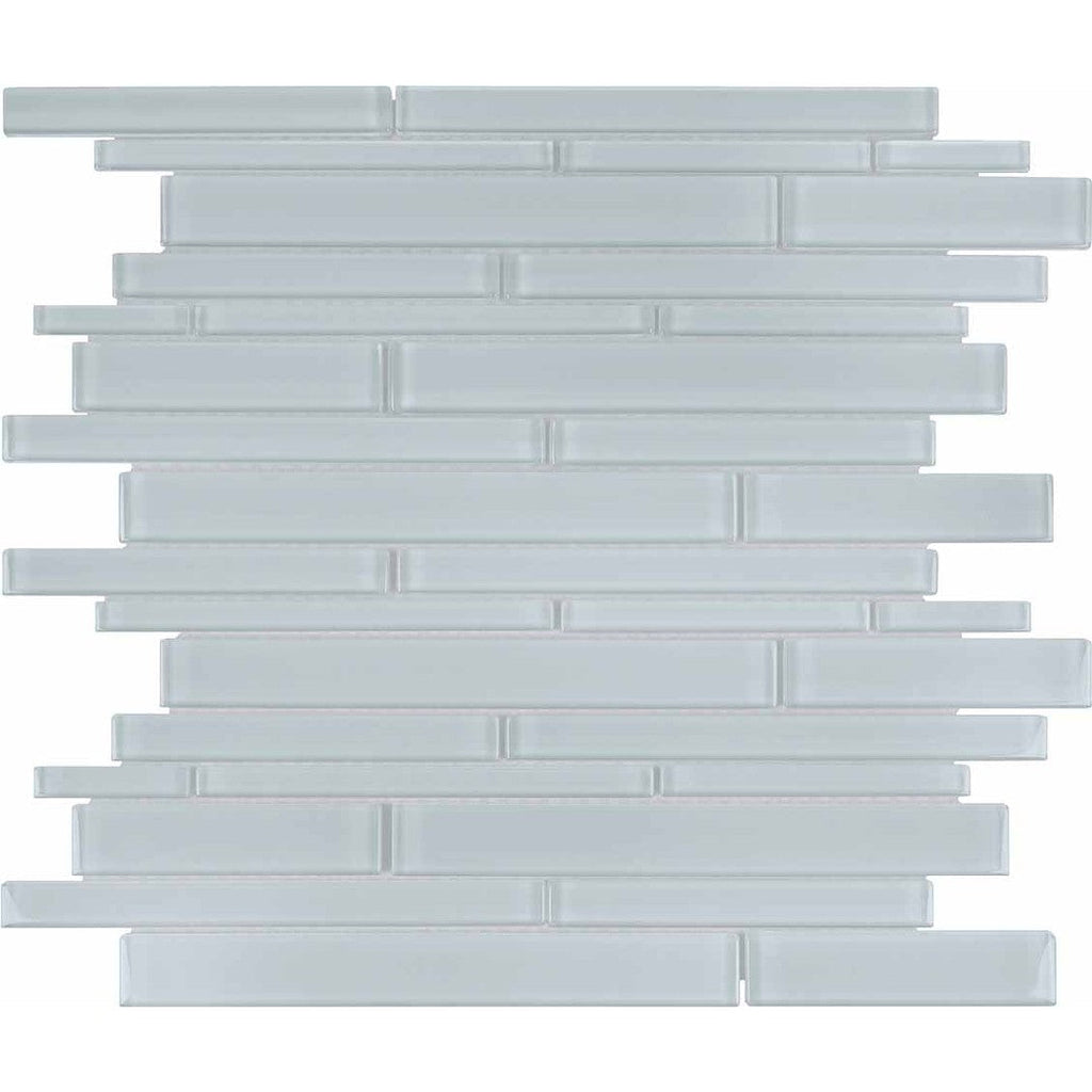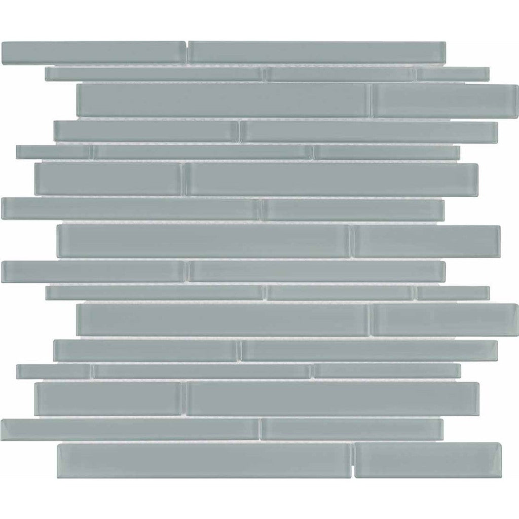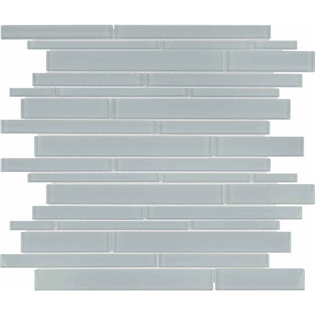 Crossville Elements Glass Posh 12x15 Gloss Glass Random Strip Mosaic features varied strip lengths for a textured, modern look. The glossy glass enhances wall surfaces with layered vibrancy and visual depth.