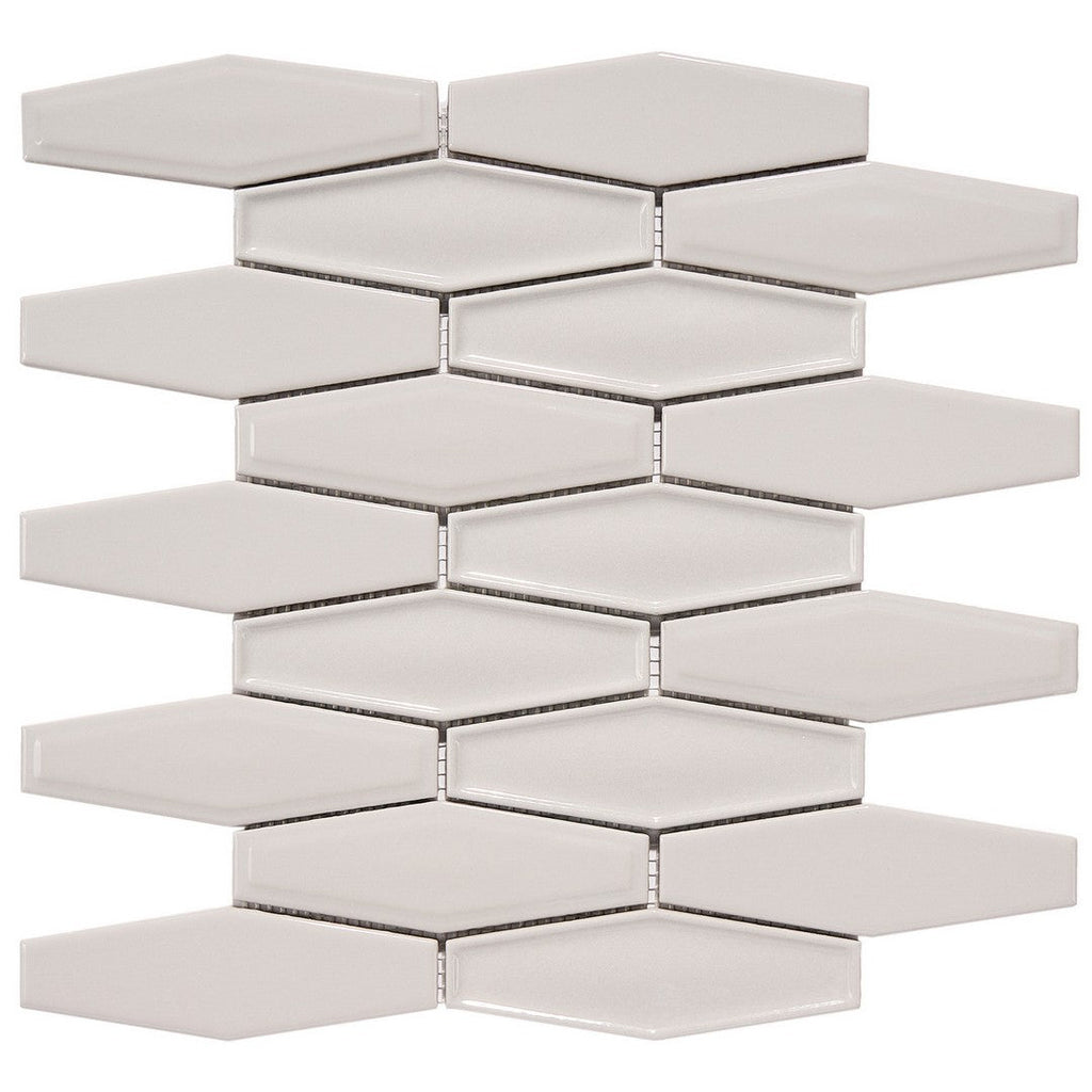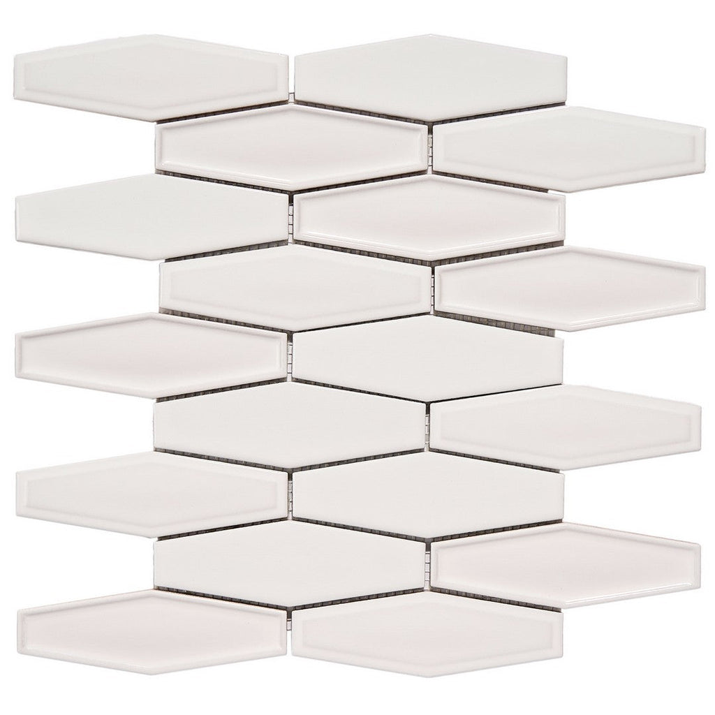 Crossville Studio C Elongated Hexagon 10" x 11" Glossy Porcelain Mosaic puts a fresh, contemporary twist on a traditional geometric pattern, featuring a high-shine finish that reflects light beautifully. These elegant porcelain mosaics are perfect for creating a sophisticated backsplash or a statement wall that balances modern flair with a clean, polished look.