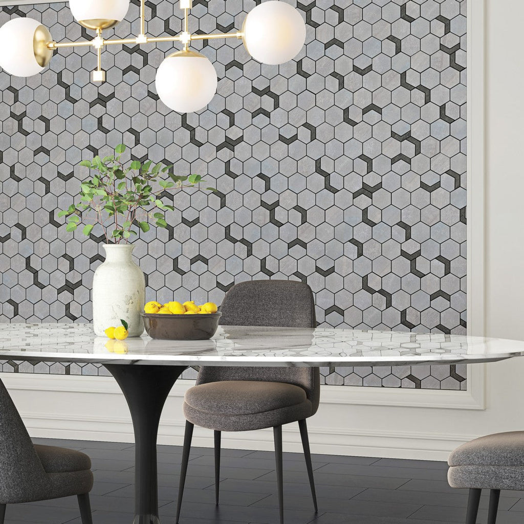 Crossville Native Metal 11x12 Unpolished Porcelain 2 Hexagon Mixed Mosaic brings geometric sophistication to feature walls and accent areas. Its hexagon pattern adds depth while maintaining the strength and performance of porcelain.
