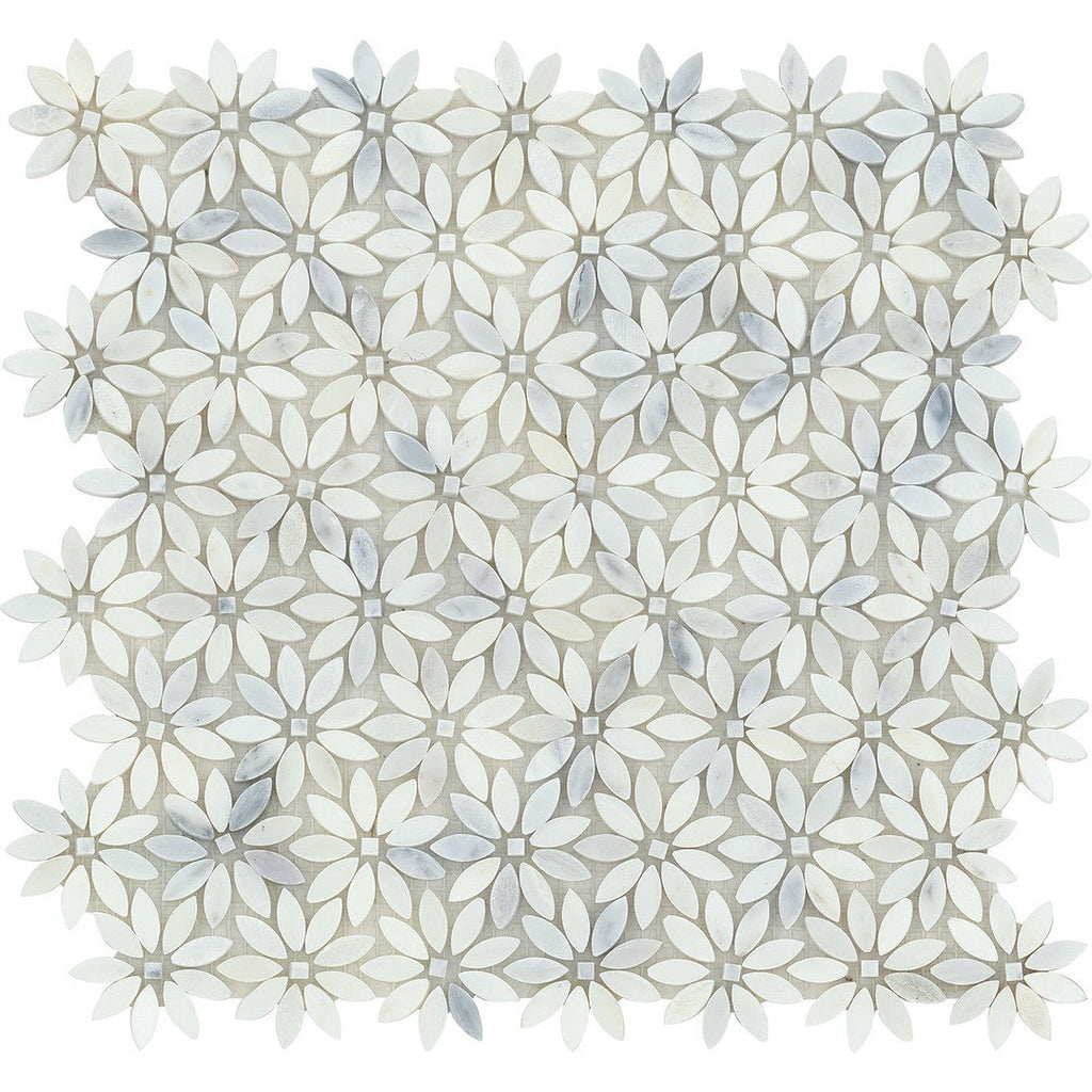 Emser Marble Winter Frost 12" x 13" Polished Marble Daisy Mosaic is a delightful choice for those seeking a whimsical yet elegant design. This daisy-shaped mosaic features a polished finish that showcases the unique patterns of Winter Frost marble. Perfect for accent walls, backsplashes, or floors, this tile adds a charming touch to any space. Transform your interiors with the playful elegance of Emser Marble Winter Frost.