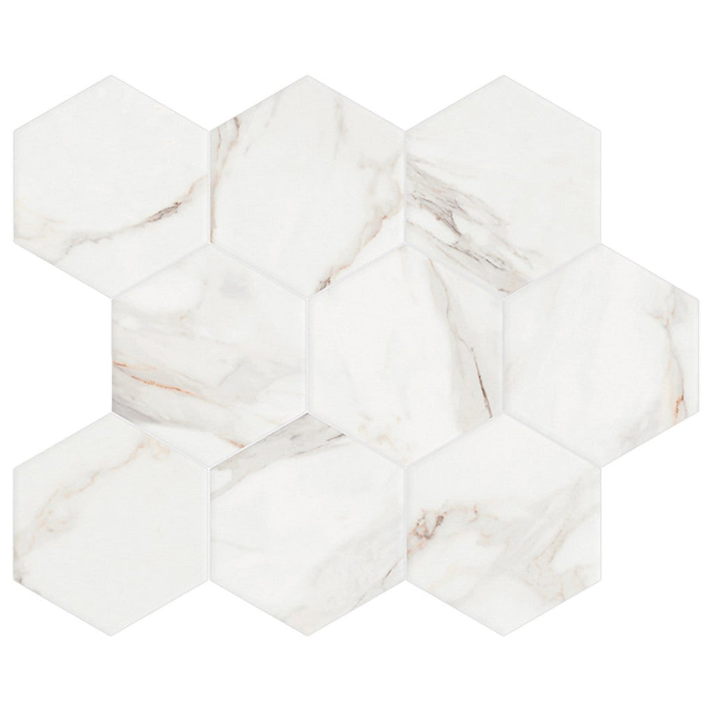Keystone Calacatta 12" x 12" Polished Porcelain Hexagon Mosaic enhances spaces with glossy porcelain tiles cut into hexagon shapes, creating a polished marble effect that’s perfect for luxurious bathrooms and kitchen backsplashes.