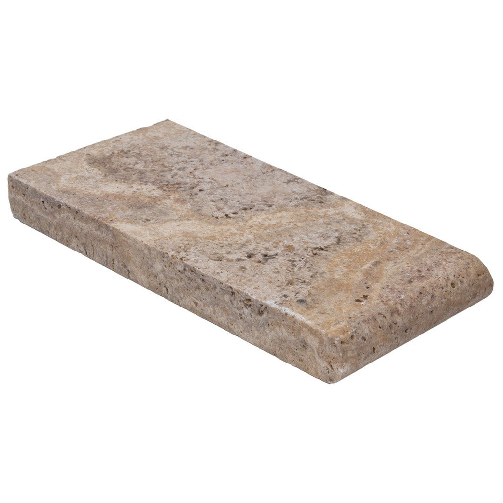 Keystone Colorado 6" x 12" Travertine 3cm Bullnose Coping features a medium-thickness profile with a smooth edge, ideal for step treads, pool coping, and outdoor transitions with natural stone elegance.