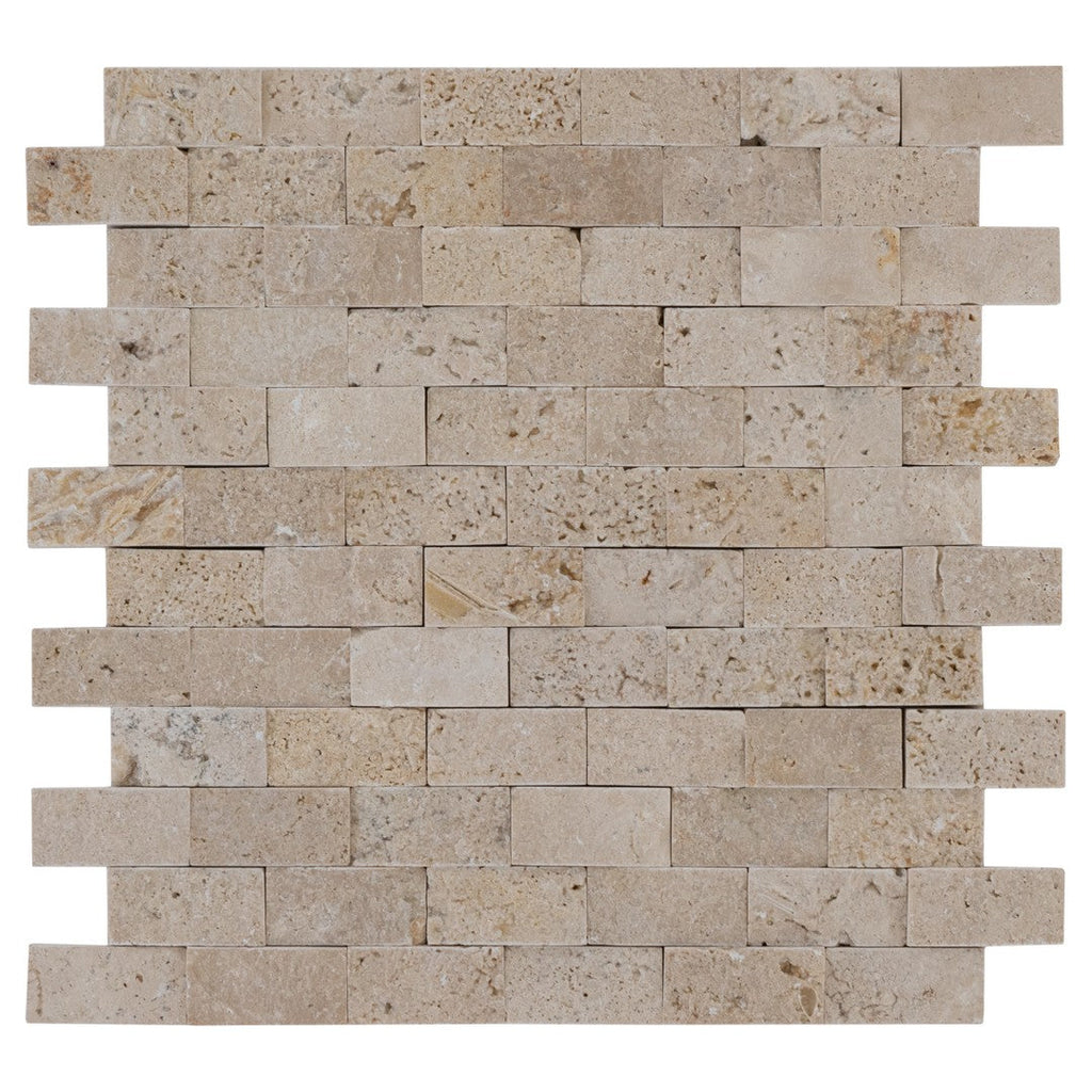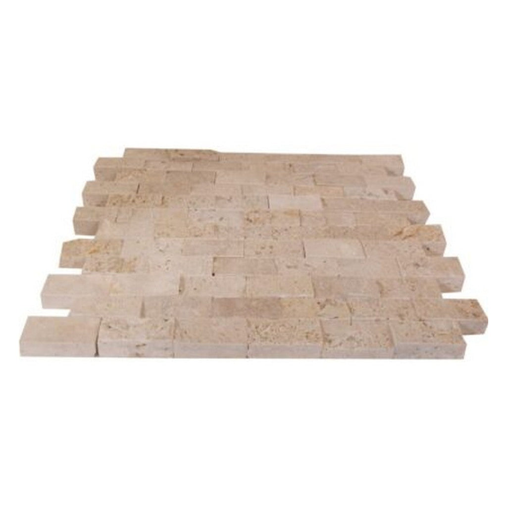 The Keystone Extra Light 12" x 12" Split Face Natural Stone 1x2" Mosaic offers a textured surface with soft beige tones, delivering a dimensional, natural look. This mosaic is perfect for feature walls, fireplaces, and vertical applications needing tactile interest.