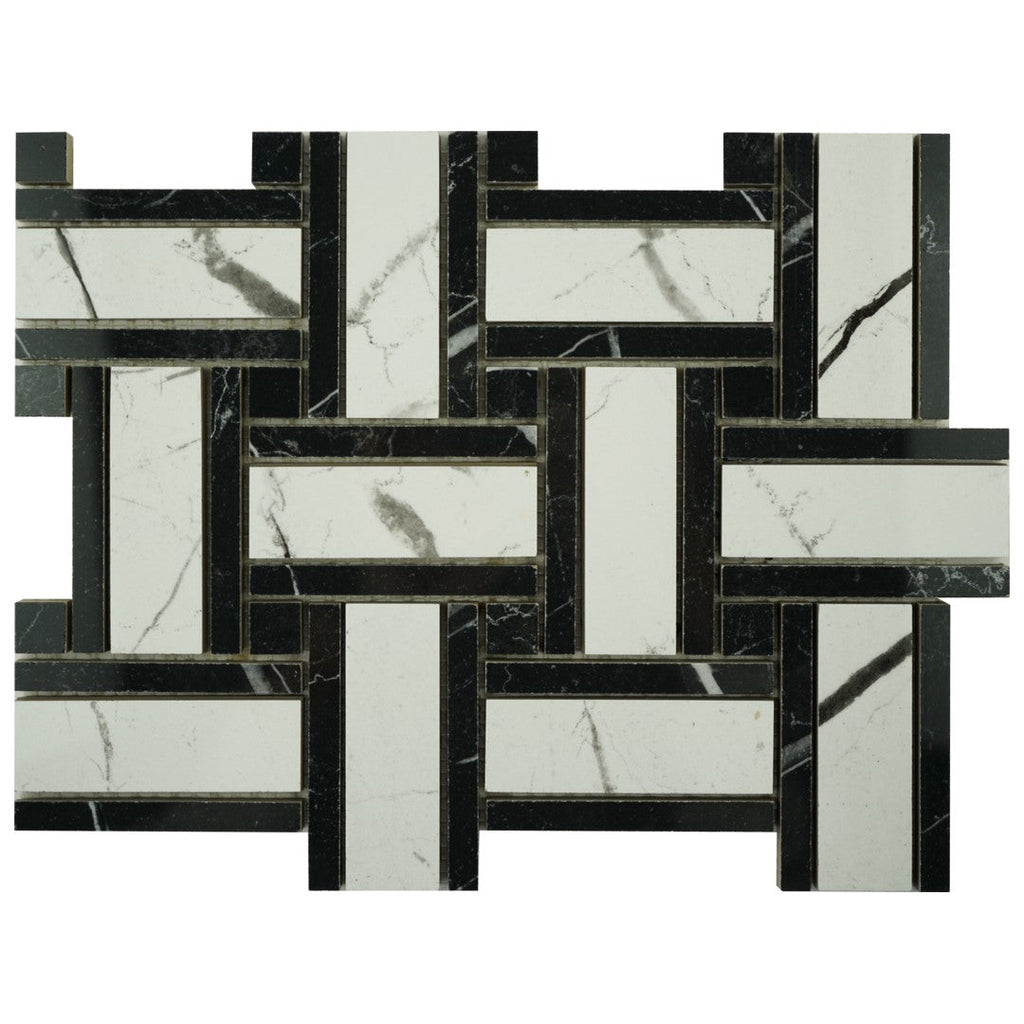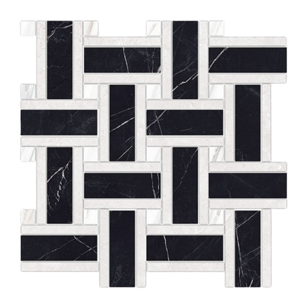 Keystone Marquina Polished Porcelain Basket Mosaic creates a woven visual texture using bold black porcelain with white veining. This polished mosaic is perfect for walls and backsplash designs aiming for a sophisticated, designer look.