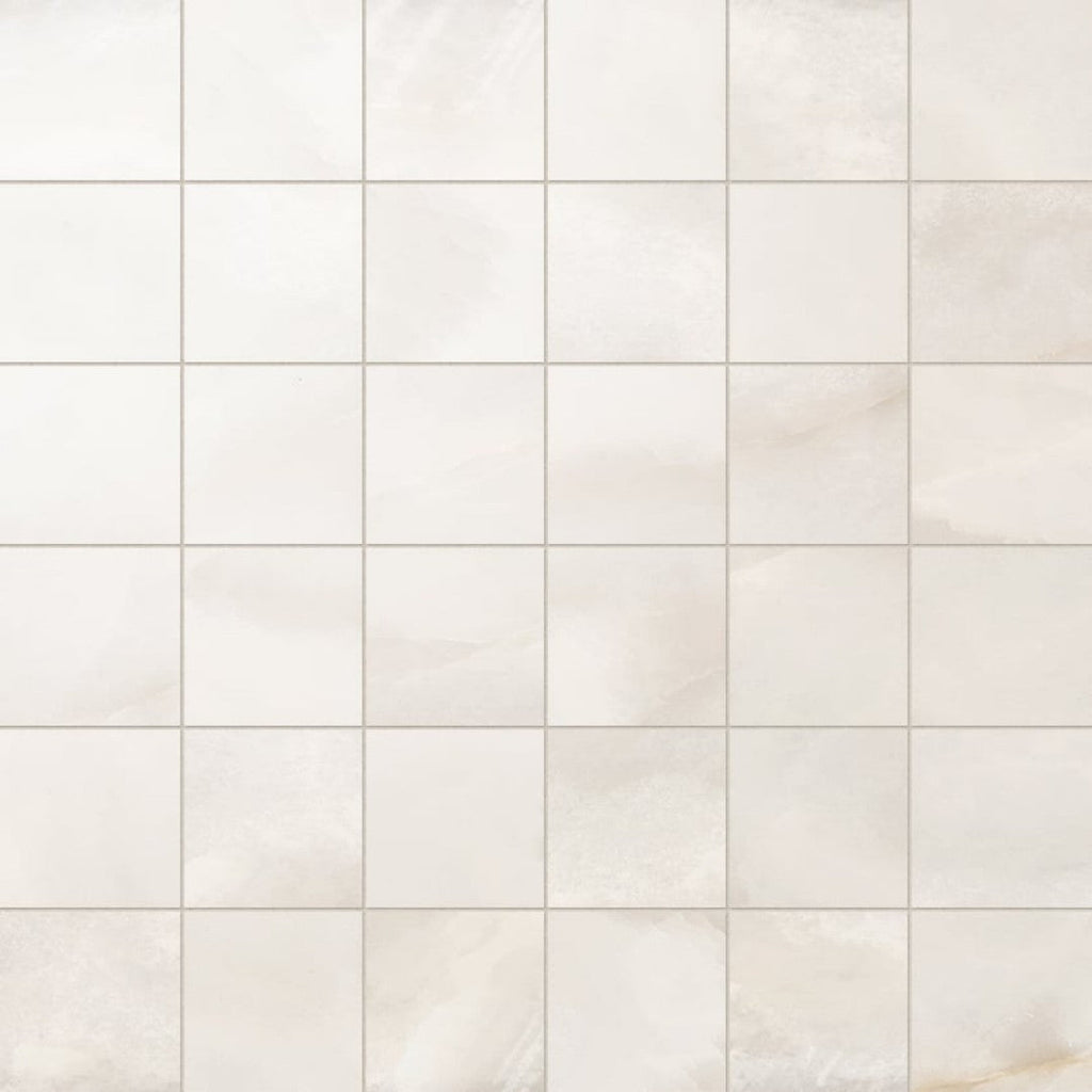 Milestone Onyx 12x12 Polished Porcelain 2 Mosaic features a glossy surface that enhances light reflection and depth in detailed mosaic patterns. Perfect for decorative accents, this mosaic tile blends durability with a high-end, polished aesthetic.