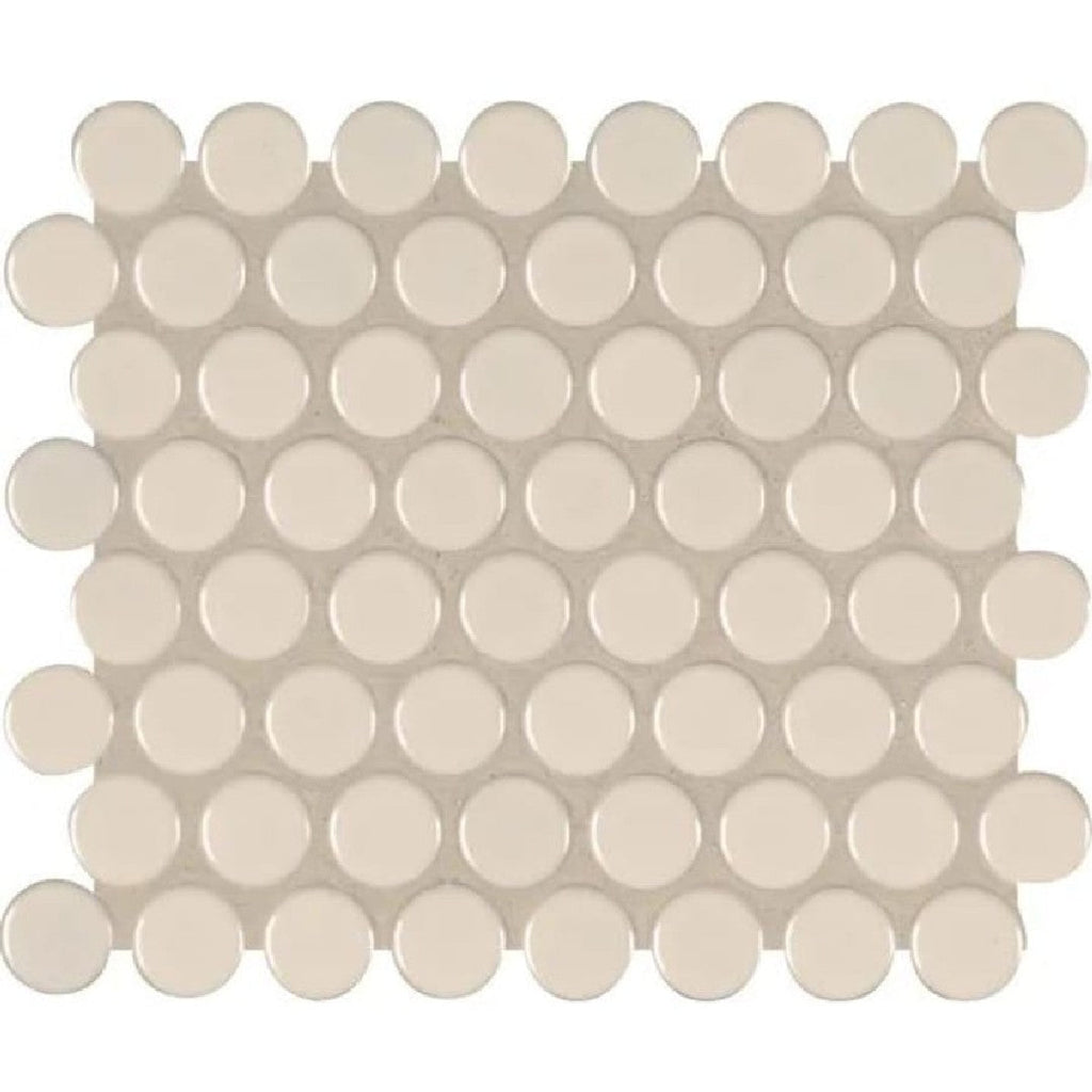 MS International Almond 12" x 13" Glossy Penny Round Porcelain Mosaic brings a playful yet refined touch to your surfaces. This charming glossy penny round porcelain mosaic is ideal for adding unique visual interest to backsplashes, bathroom walls, or creative feature areas, blending vintage appeal with modern durability.