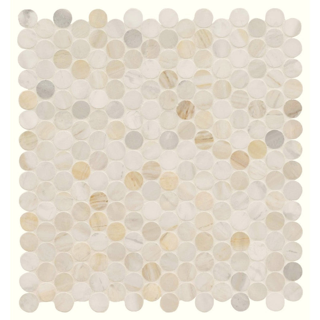 MS International Athena Gold 12" x 12" Honed Penny Round Marble Mosaic brings a timeless penny round design to upscale interiors, featuring honed gold-veined marble for a refined, tactile finish. Ideal for shower floors, feature walls, and wainscoting, its round tiles deliver both slip-resistance and classic charm in luxury bathroom and kitchen projects.