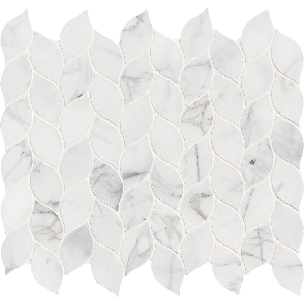 MS International Calacatta Blanco 11.62" x 13.38" Polished Leaf Marble Mosaic introduces graceful, leaf-shaped marble tiles to your space for a unique and refined finish. With a polished surface and intricate natural veining, this mosaic is ideal for elevating kitchen backsplashes, bathroom feature walls, or luxury shower niches. It combines natural beauty with timeless sophistication.