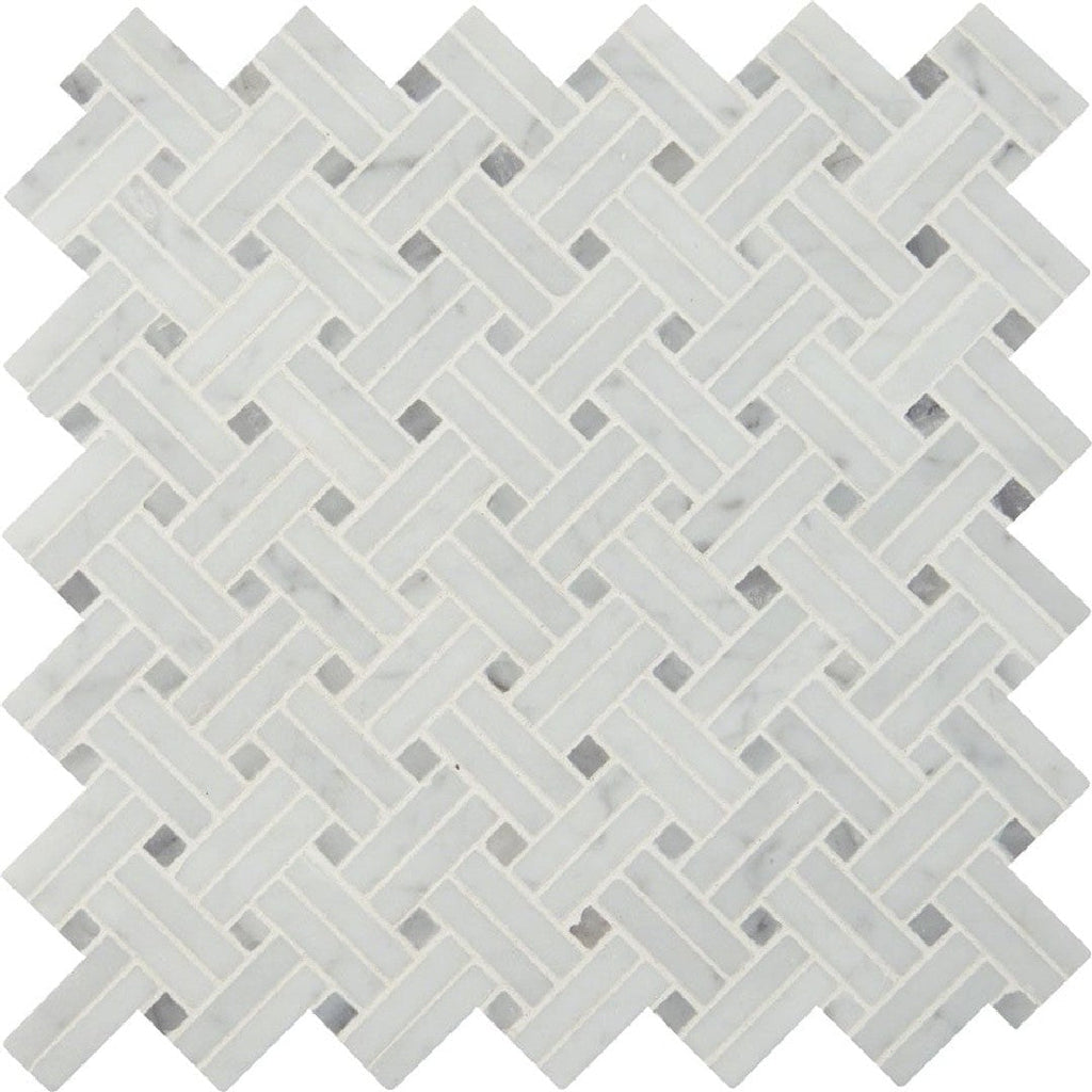 MS International Carrara White 12" x 12" Polished Basketweave Marble Mosaic elevates your space with classic luxury. Featuring a polished finish, this stunning Carrara White marble basketweave mosaic is perfect for creating dazzling kitchen backsplashes, opulent bathroom floors, or sophisticated feature walls, adding a brilliant and timeless touch.
