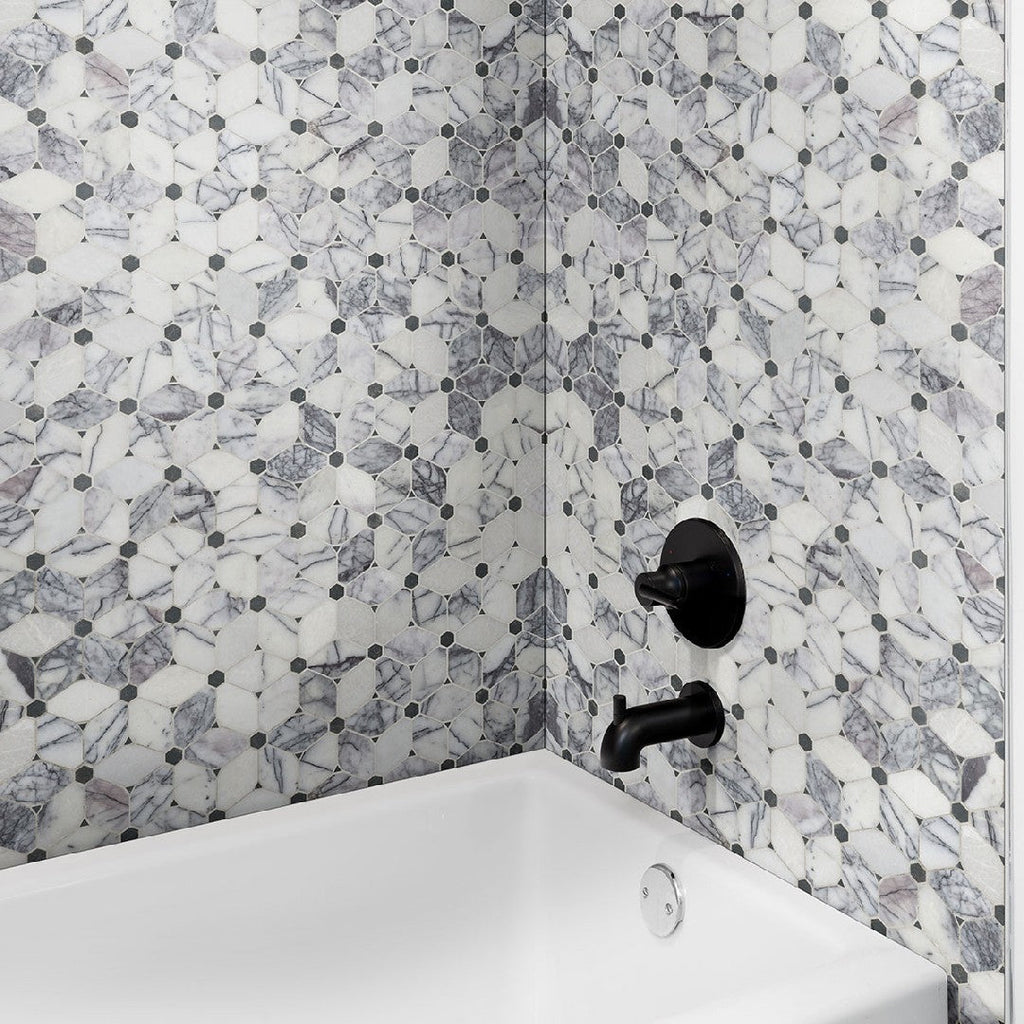 MS International Cecily Lilac 11" x 12" Polished Hexagonal Marble Mosaic offers a delicate and unique color palette with a modern geometric design. The polished hexagonal shape combined with the soft lilac tones of this marble mosaic, sized at 11" x 12", is perfect for adding a subtle pop of color and luxury to backsplashes or accent walls. It’s an elegant choice for a serene and stylish space.