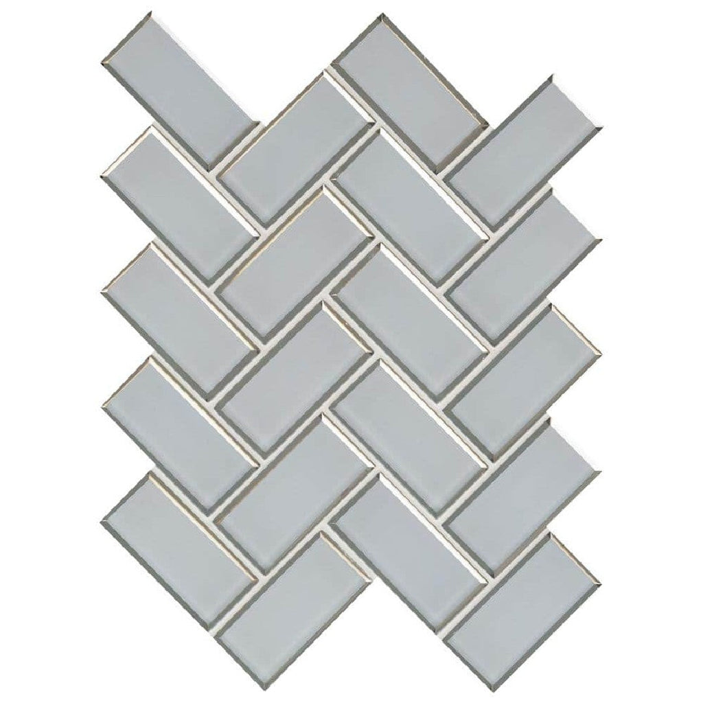 MS International Ice Bevel 11.08" x 13.86" Glossy Herringbone Glass Mosaic creates a dynamic herringbone pattern with elegant beveled glass. This luxurious mosaic is perfect for creating stunning kitchen backsplashes, feature walls, or shower surrounds, adding depth and sophisticated sparkle to your design.