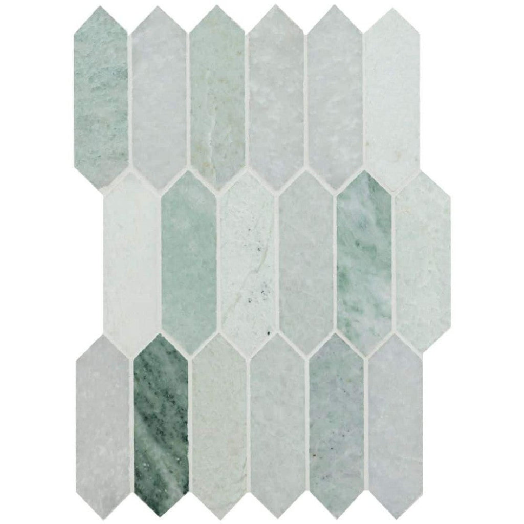 MS International Icelandic Green 12" x 12" Polished Picket Marble Mosaic showcases a unique picket shape in a stunning polished green marble. This distinctive mosaic is perfect for creating luxurious bathroom floors, elegant kitchen backsplashes, or sophisticated feature walls, bringing a touch of natural beauty and timeless style.