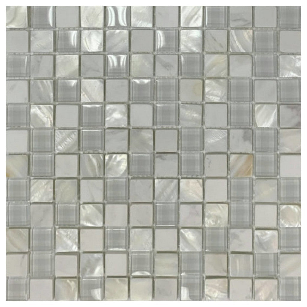 Qualis Ceramica Chelsea 11.7x11.7 Glass Marble Mix Mother Of Pearl Mosaic blends Glossyy glass, marble, and mother-of-pearl tiles for a luminous effect. Ideal for kitchen backsplashes, bathroom walls, and feature spaces, it adds visual depth and contemporary elegance. The Chelsea Glass Marble Mix Mother Of Pearl Mosaic is durable, easy to clean, and highly versatile. Its shimmering finish transforms interiors into luxurious, sophisticated spaces with long-lasting aesthetic appeal and premium mosaic craftsmanship.