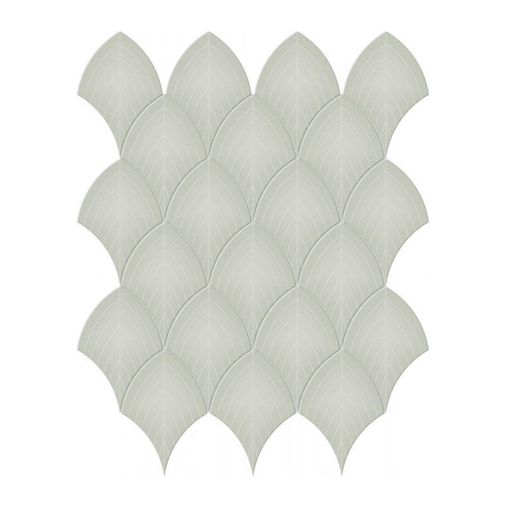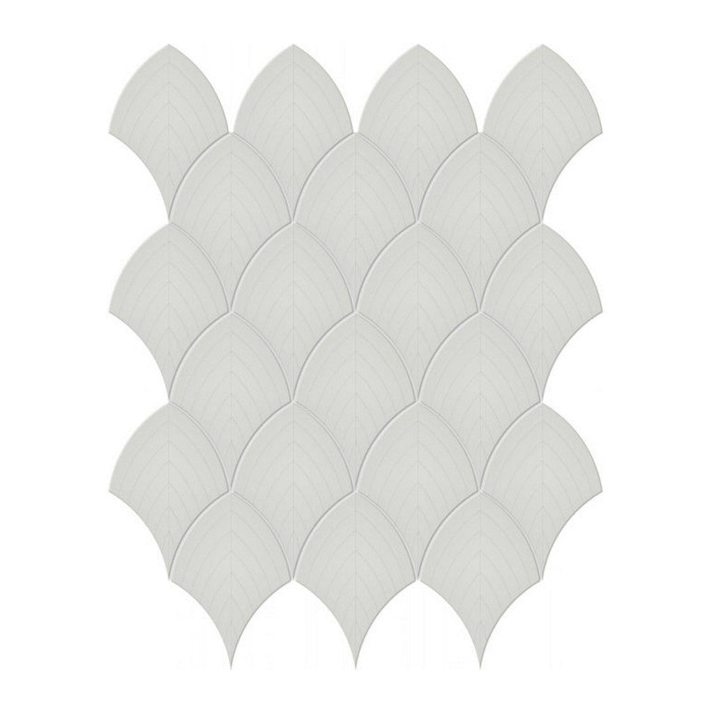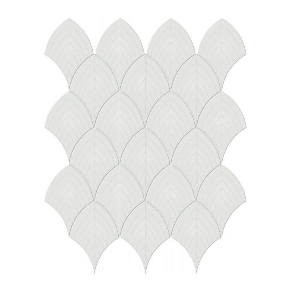 Qualis Ceramica Traditions 10.75" x 13.35" Glossy Porcelain Scallop Mosaic adds a flowing, scalloped pattern to interior surfaces. Its glossy finish reflects light beautifully, enhancing visual depth and providing a decorative, luxurious touch for walls and feature areas.