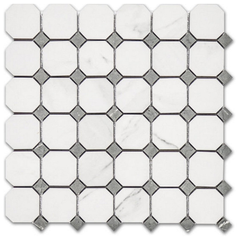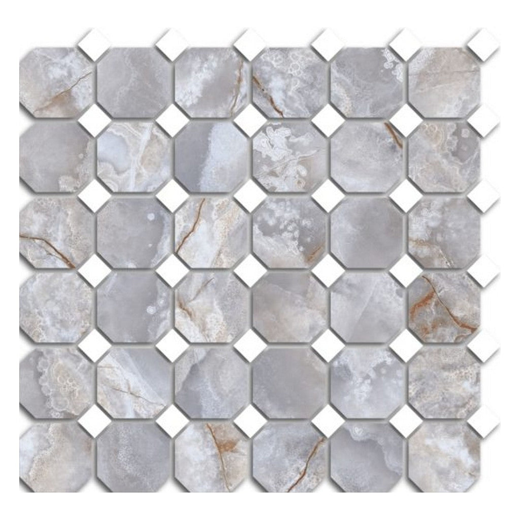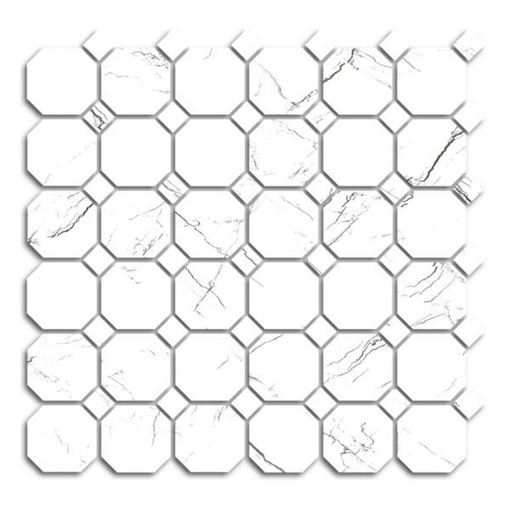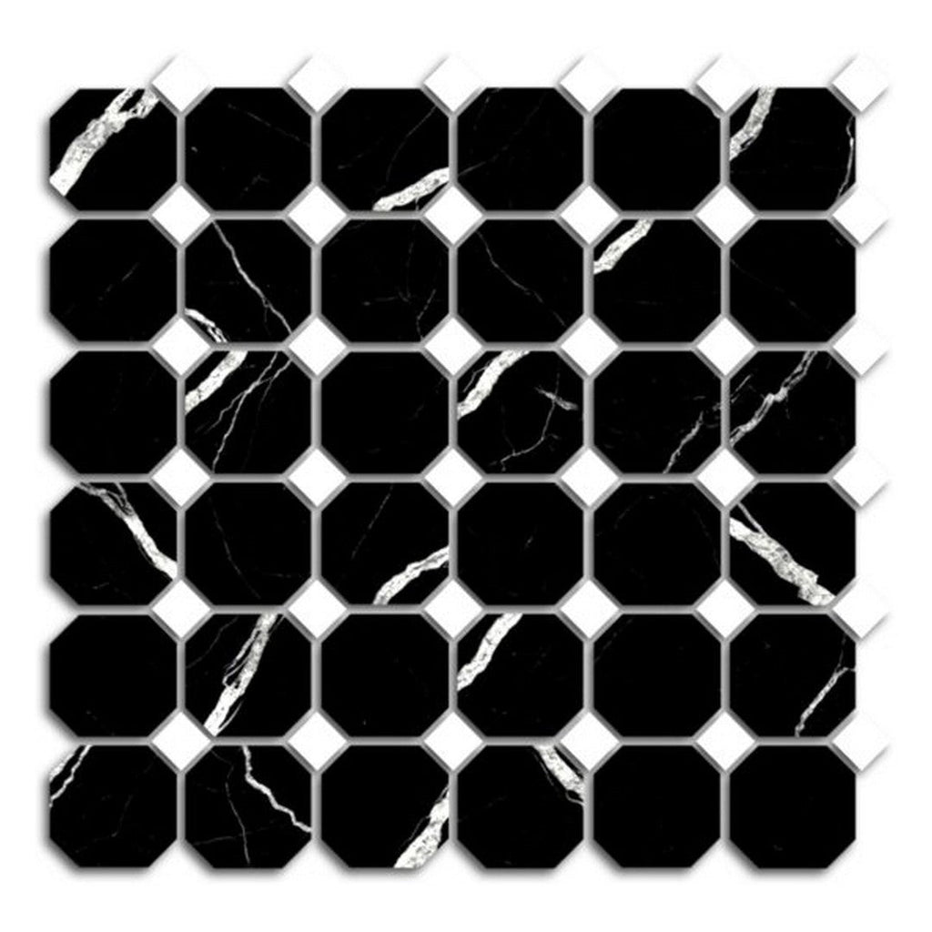 Qualis Ceramica Treasure 12" x 12" Polished Porcelain Octagon Dot Mosaic features a timeless octagon-dot design with a polished surface. This versatile porcelain mosaic works for floors, walls, or accent areas, combining easy maintenance, durability, and a sophisticated, classic look.