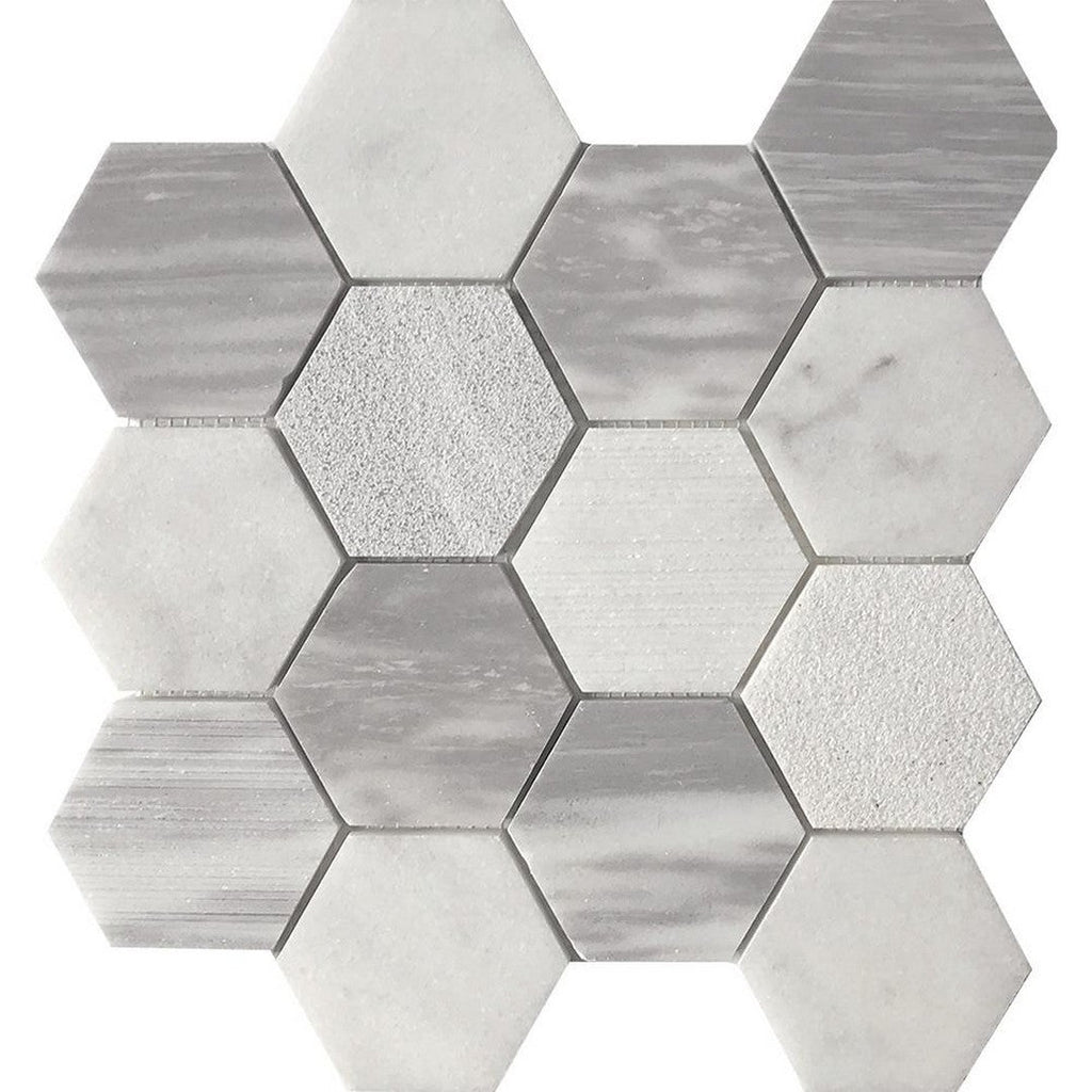 Tesoro Contempo 11.75" x 11.75" - 3" Hexagon Blend Natural Stone Mosaic combines classic design with modern appeal. This mosaic features a blend of different finishes within the 3-inch hexagon pattern, creating a sophisticated and multi-dimensional look. Perfect for bathroom floors, kitchen backsplashes, and shower walls, this natural stone mosaic is both durable and stylish. Achieve a timeless and elegant design with this Tesoro hexagon mosaic.