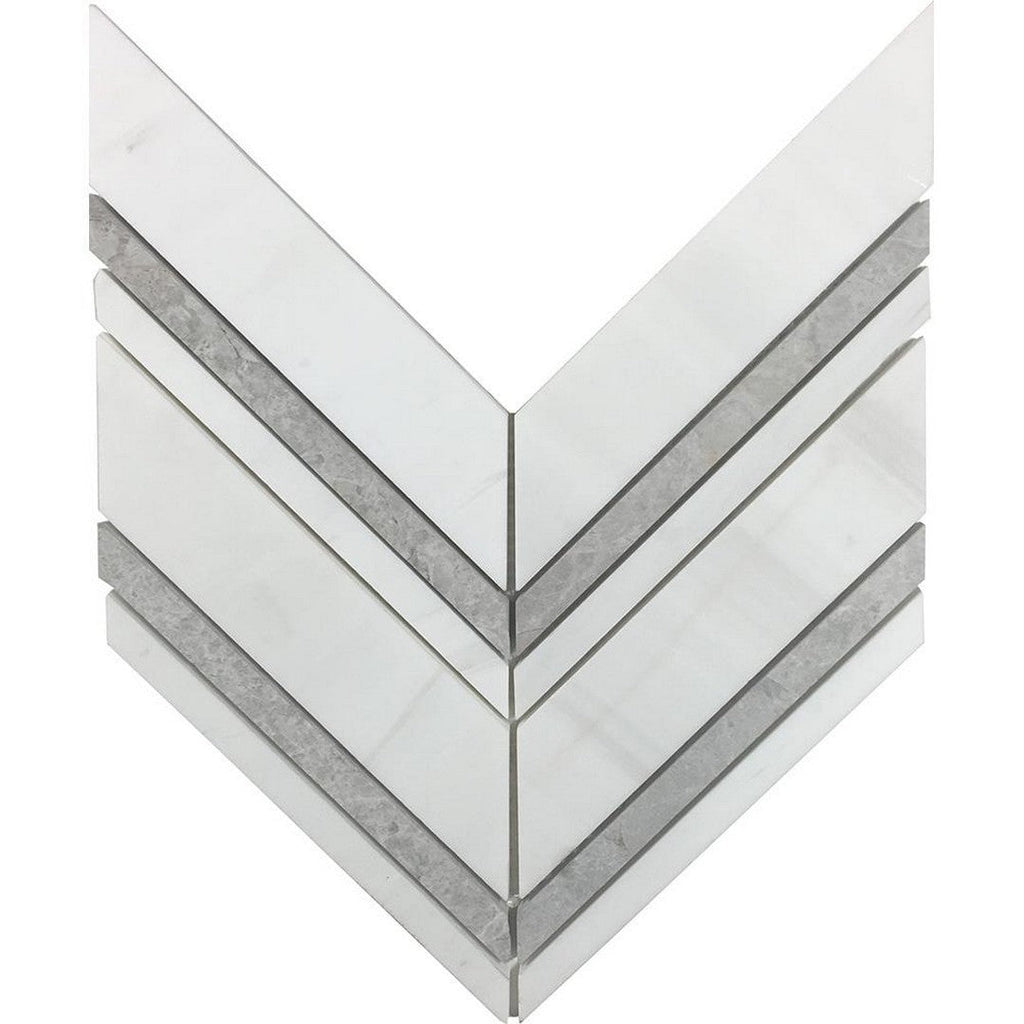 Tesoro Dolomite/Nuvoloso Blend 11.875" x 9.375" Interlocking Honed Chevron Natural Stone Mosaic brings a modern and chic aesthetic to your home. The sophisticated chevron pattern, crafted from a blend of honed dolomite and nuvoloso natural stone, is ideal for creating stunning backsplashes, accent walls, and shower surrounds. This interlocking natural stone mosaic is a top choice for adding both texture and visual interest.