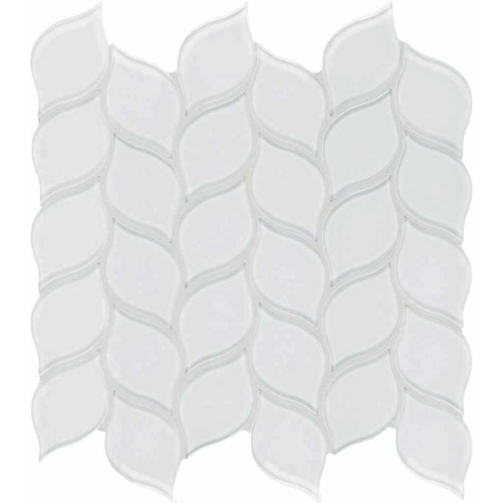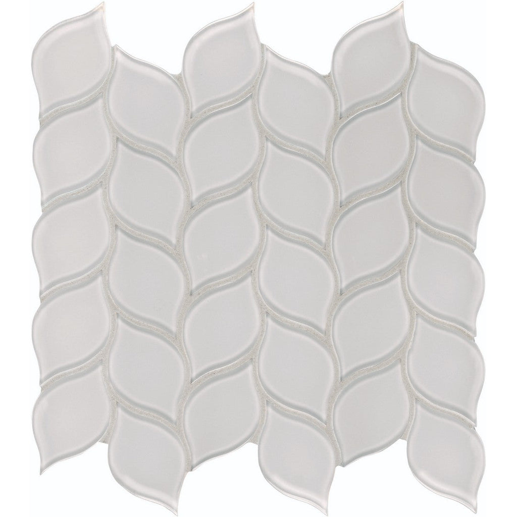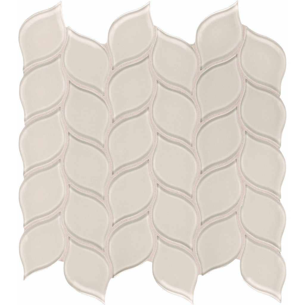 Tesoro Element 11.25" x 11.75" Interlocking Petal Glass Mosaic features a soft and beautiful floral-inspired design. The interlocking petal pattern in a durable glass mosaic is perfect for adding a delicate and artistic touch to your walls. This unique glass mosaic tile is ideal for creating a gentle, flowing backsplash or a serene accent wall.