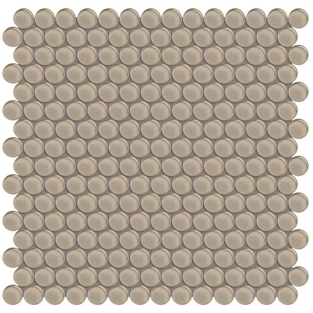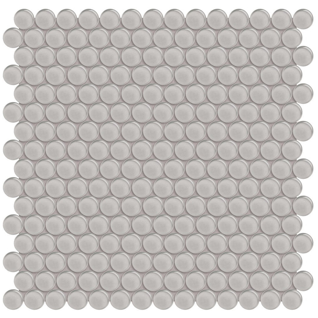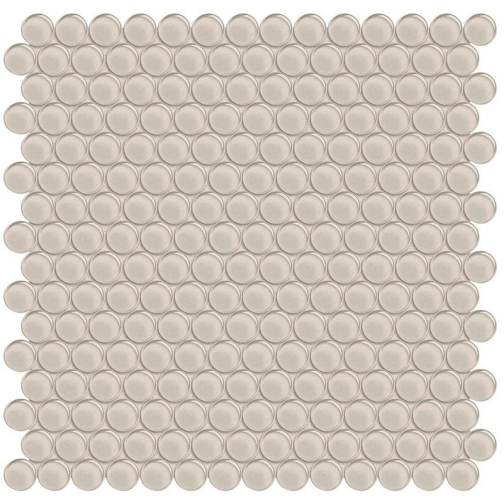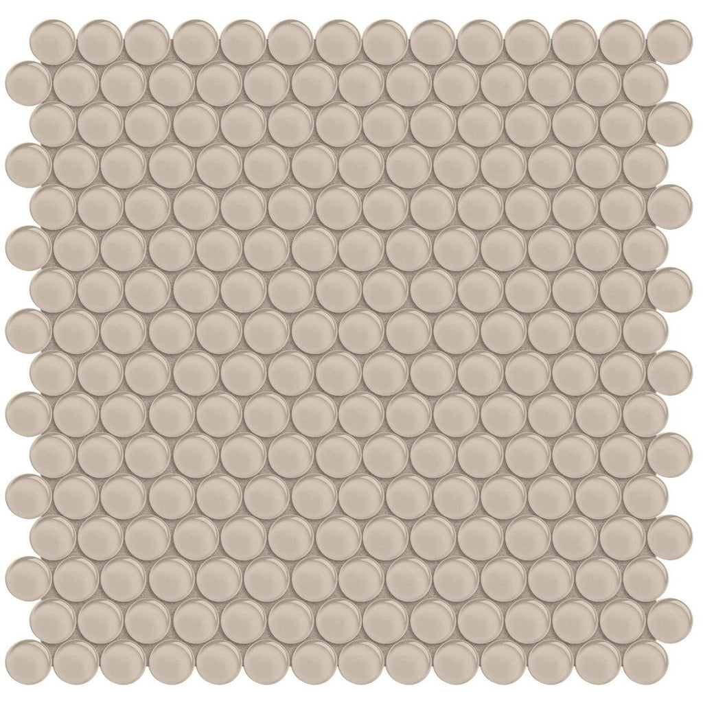 Tesoro Element 11.50" x 11.75" Interlocking Penny Round Glass Mosaic is a fun and retro-inspired option for a stylish backsplash or accent wall. The classic penny round pattern, reimagined in a durable interlocking glass mosaic, creates a timeless and whimsical feel. This popular glass mosaic tile is perfect for adding texture and visual interest to any room.