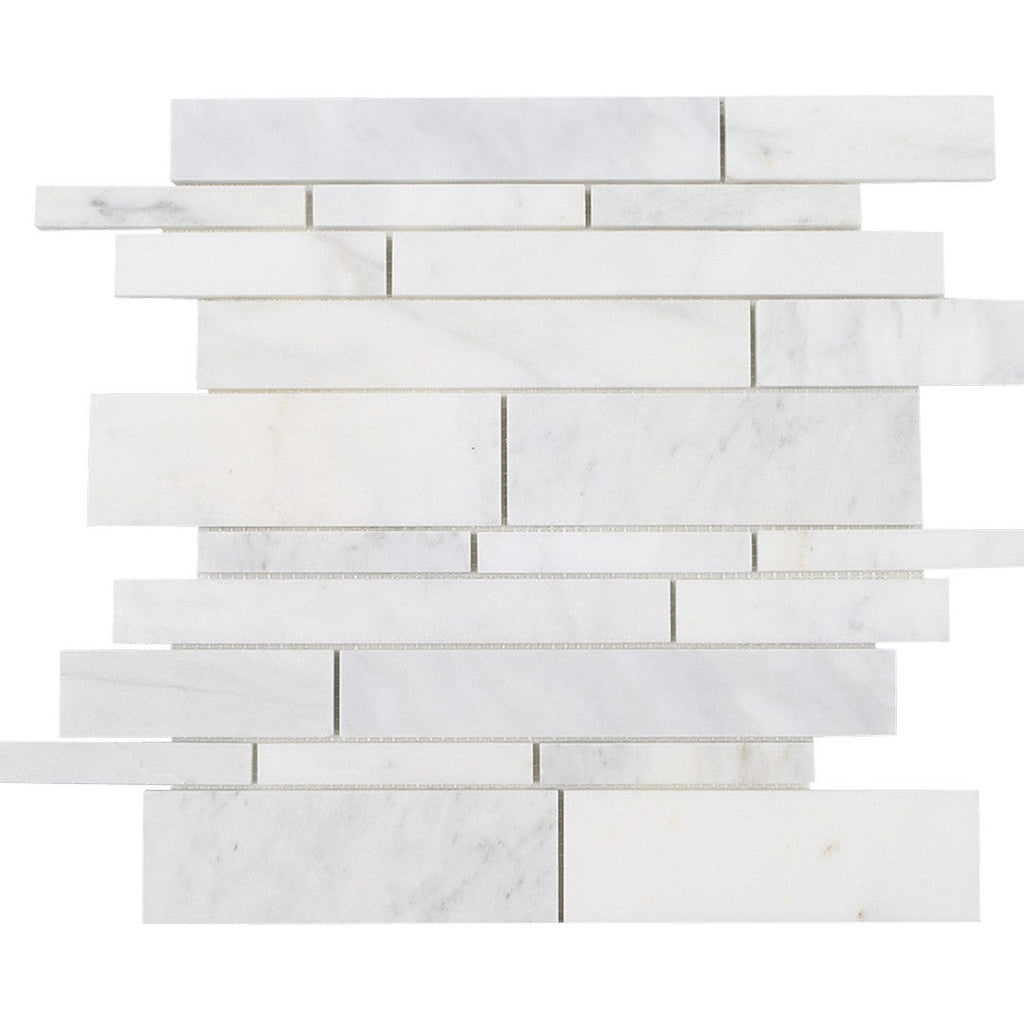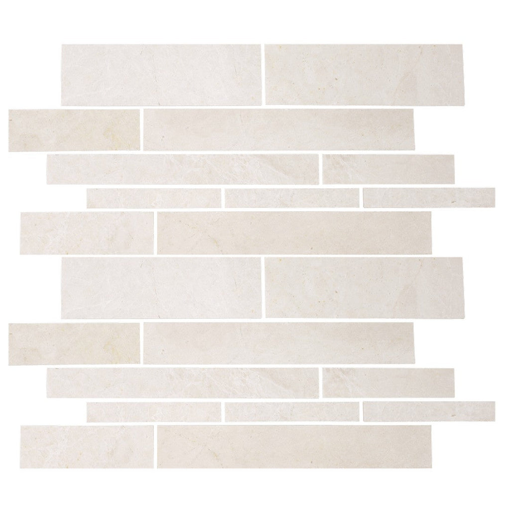 Tesoro Ice 12" x 12" Honed Random Linear Natural Stone Mosaic is a sophisticated mosaic featuring a variety of linear natural stone pieces in a honed finish, creating an artistic, randomized texture on a 12" x 12" sheet. This random linear mosaic is ideal for contemporary backsplashes, niche accents, and unique wall installations.