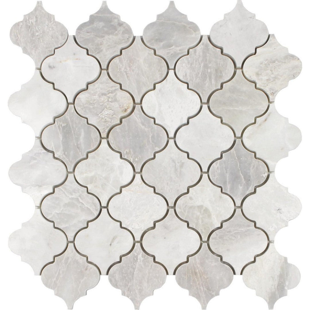Tesoro Iceberg 12.25" x 9.75" Polished Arabesque Natural Stone Mosaic captures a classic, ornate style with its flowing Arabesque design in a highly reflective polished natural stone finish. This polished mosaic is a dramatic choice for high-end backsplashes and feature walls, offering timeless sophistication in a 12.25" x 9.75" sheet size.