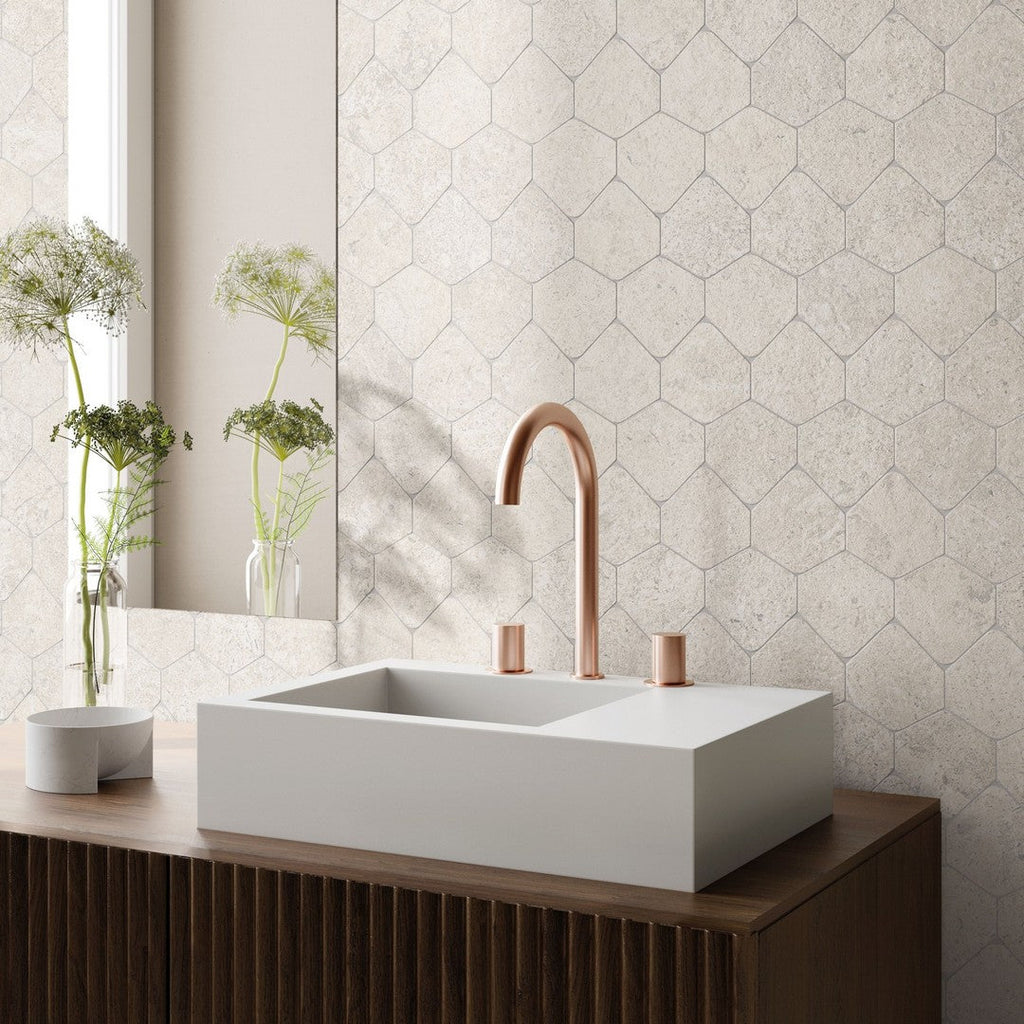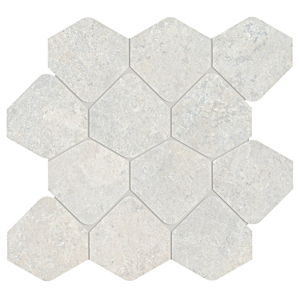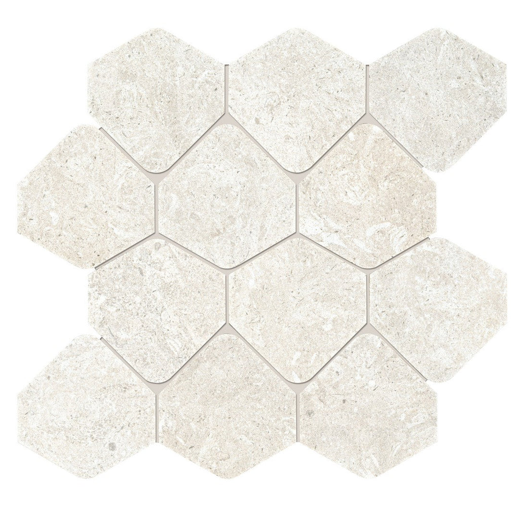 Tesoro Kalkarea 12" x 12" Matte 3" Hexagon Porcelain Mosaic introduces a popular geometric shape with a practical, slip-resistant matte finish. This 12x12 matte hexagon porcelain mosaic creates a contemporary floor or wall surface, offering the fashionable hexagon mosaic tile pattern with the long-lasting quality of porcelain.