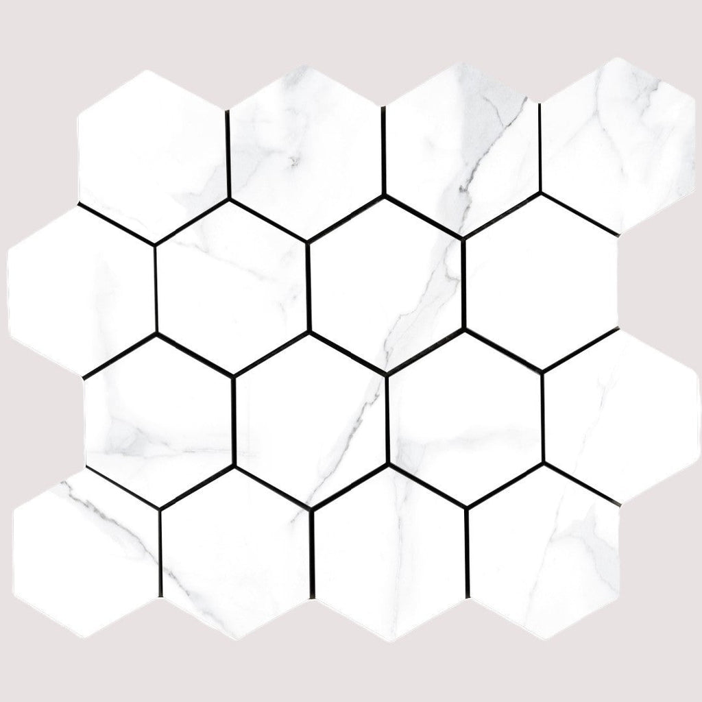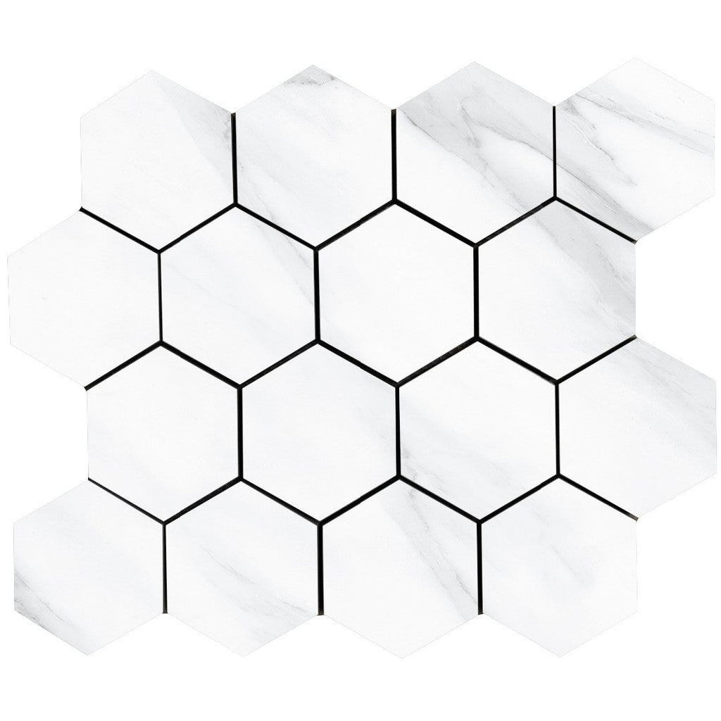Tesoro Lucca 10.25" x 11.75" Rectified Matte Porcelain 3" Hexagon Mosaic brings a geometric, contemporary flair with a subtle matte finish in a popular 3" hexagon shape, pre-mounted for easy installation. This rectified matte porcelain mosaic is a versatile choice for feature walls, backsplashes, or shower floors, offering the durability of porcelain with a modern design element. Explore the Lucca matte porcelain hexagon mosaic for a stylish, graphic accent.