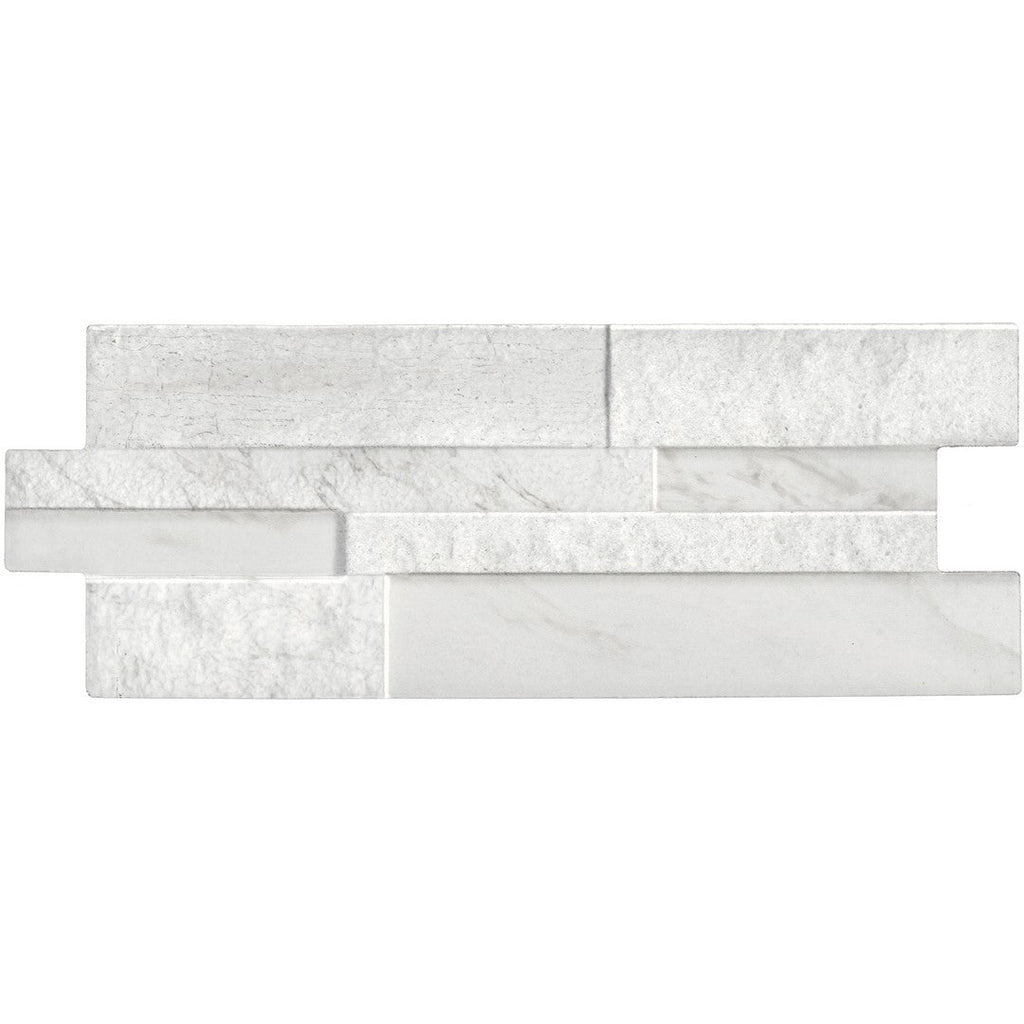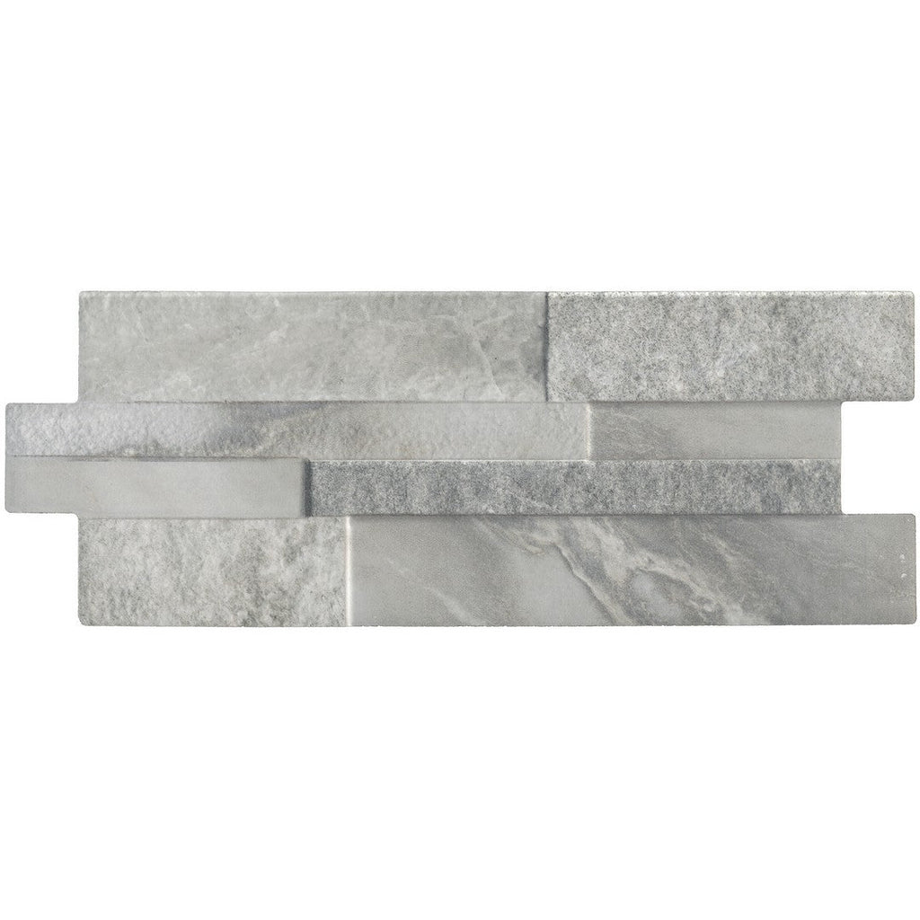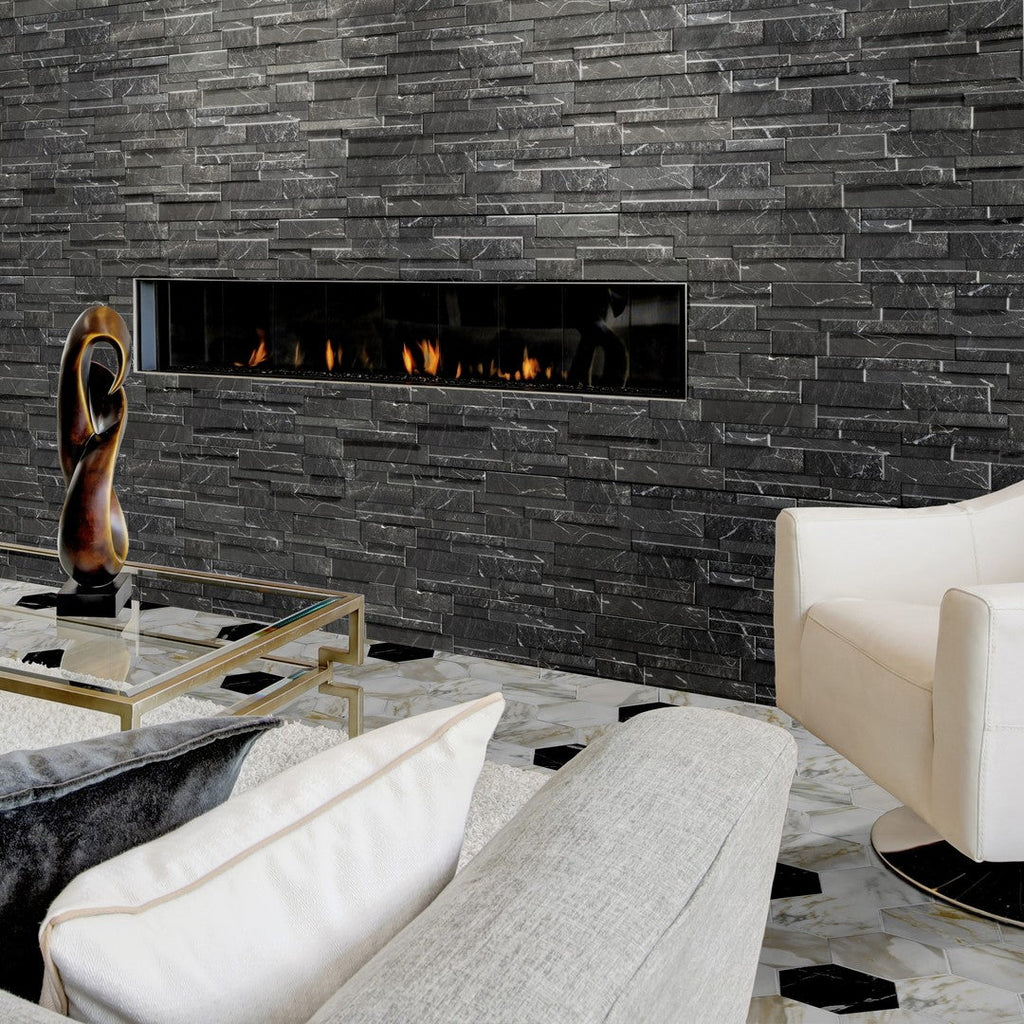 Tesoro Marmi 6.25" x 15.25" Pressed Textured Porcelain Ledgerstone offers the rustic, stacked-stone aesthetic of natural ledger panels with the superior durability and maintenance benefits of porcelain tile. Designed for wall use, this high-definition ink-jet (H.D.I.T.) product replicates a marble visual with a textured, pressed finish, providing a sophisticated yet rugged look.1 Available in versatile colors like Black, Grey, and White, this ledgerstone is an excellent choice for accent walls, fireplace surrounds, or other interior and exterior vertical applications where a dynamic, textured design with moderate to high shade variation is desired.2