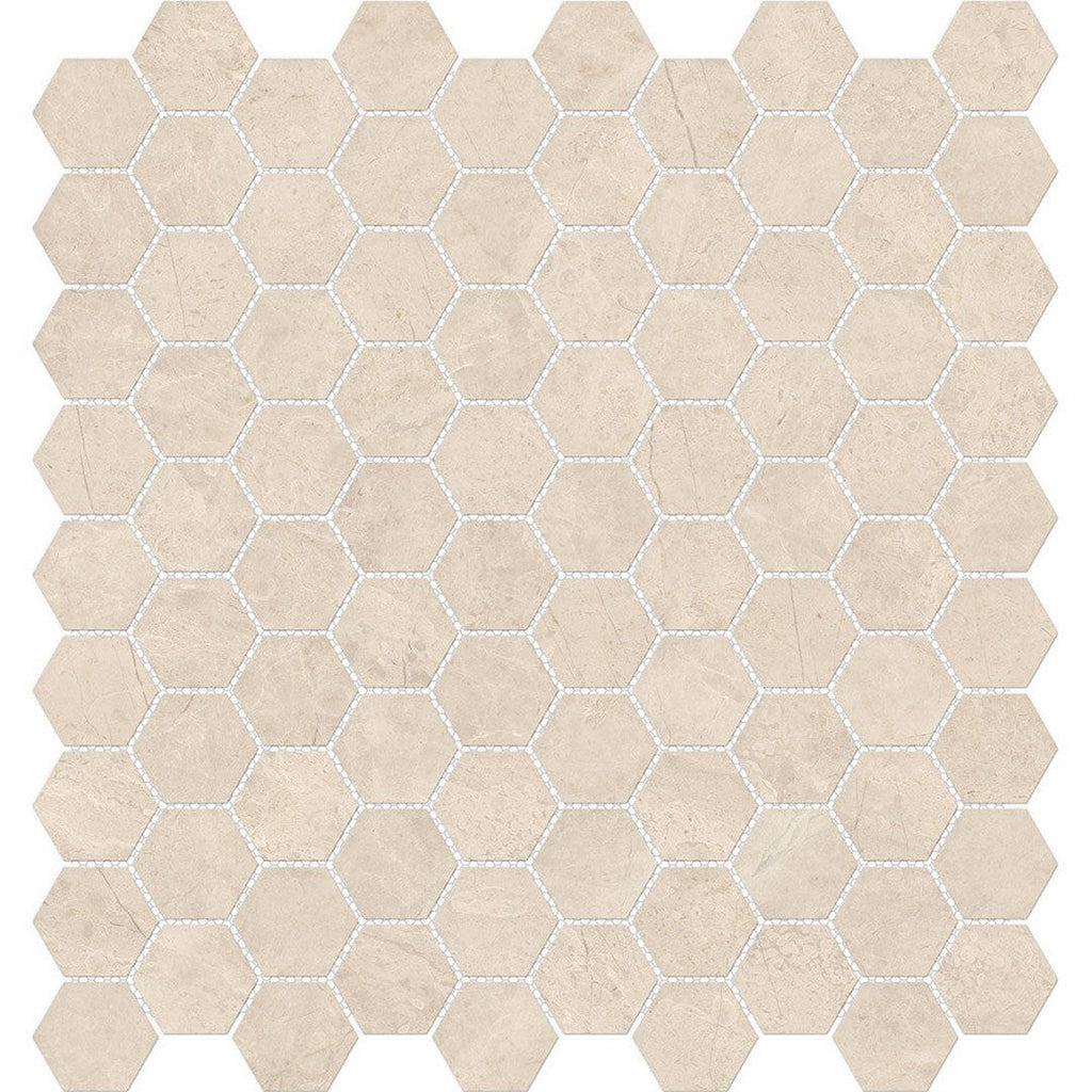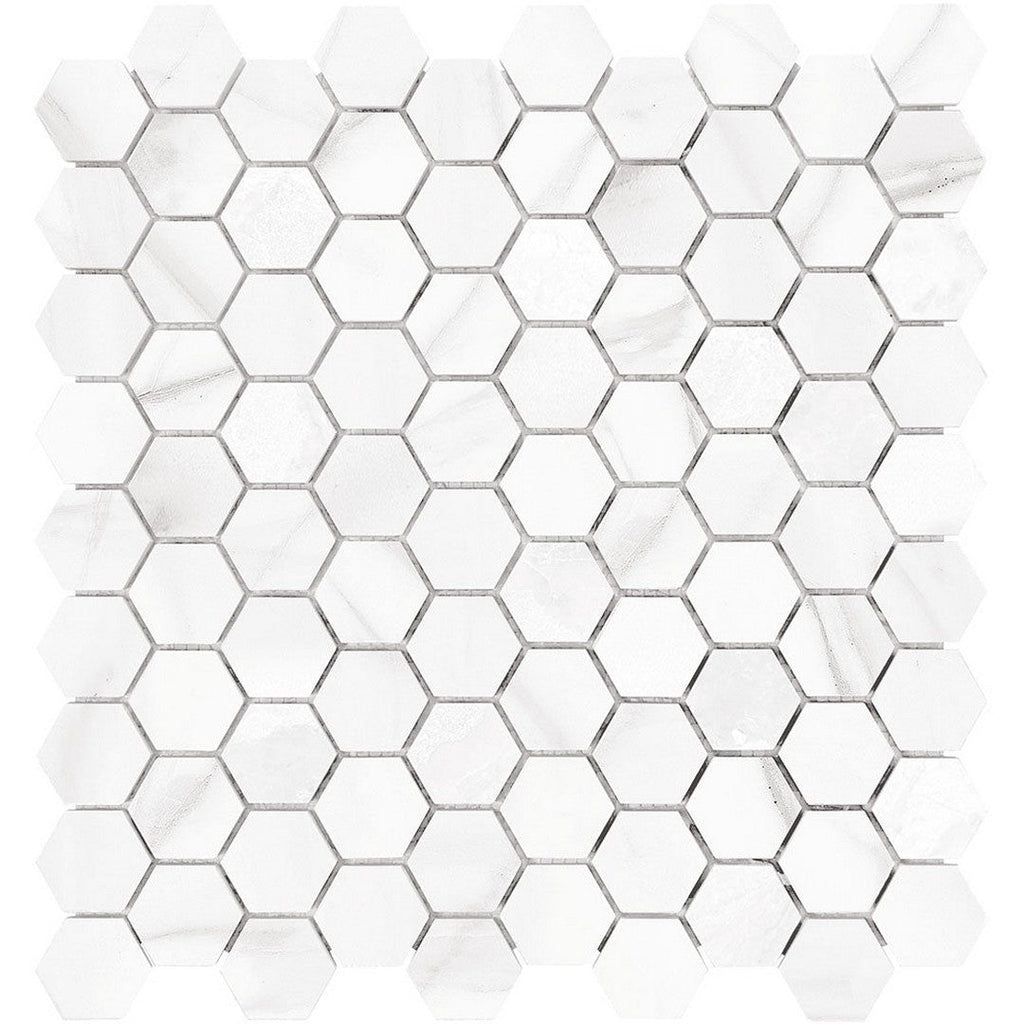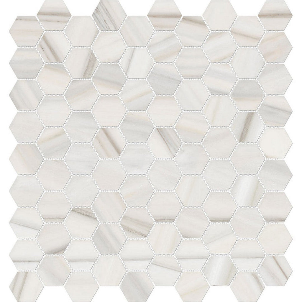 Tesoro Mayfair 11.5" x 12" Rectified Polished 1.25" Hexagon Porcelain Mosaic delivers a contemporary touch with its polished, small-scale 1.25" hexagon pattern. This 11.5x12 rectified porcelain mosaic is perfect for shower floors, accent walls, and stunning backsplashes, combining durability with dazzling design.