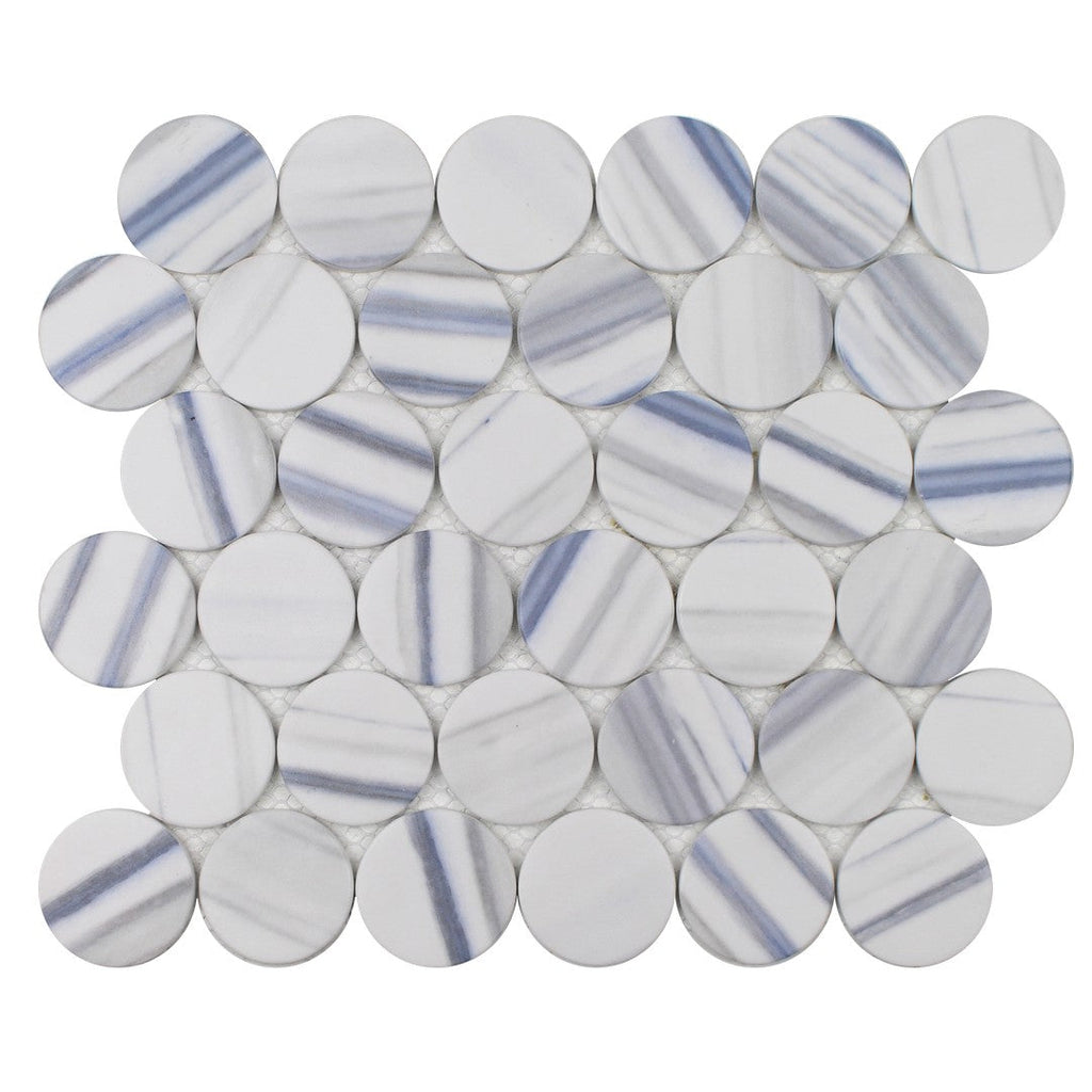 Tesoro Native 10.25" x 11.5" Matte 2" Penny Round Glass Mosaic offers a playful yet sophisticated circular pattern for unique backsplashes and accents. This 10.25" x 11.5" matte glass mosaic with 2" penny rounds adds texture, light, and a modern vintage feel, perfect for creating dynamic visual interest.