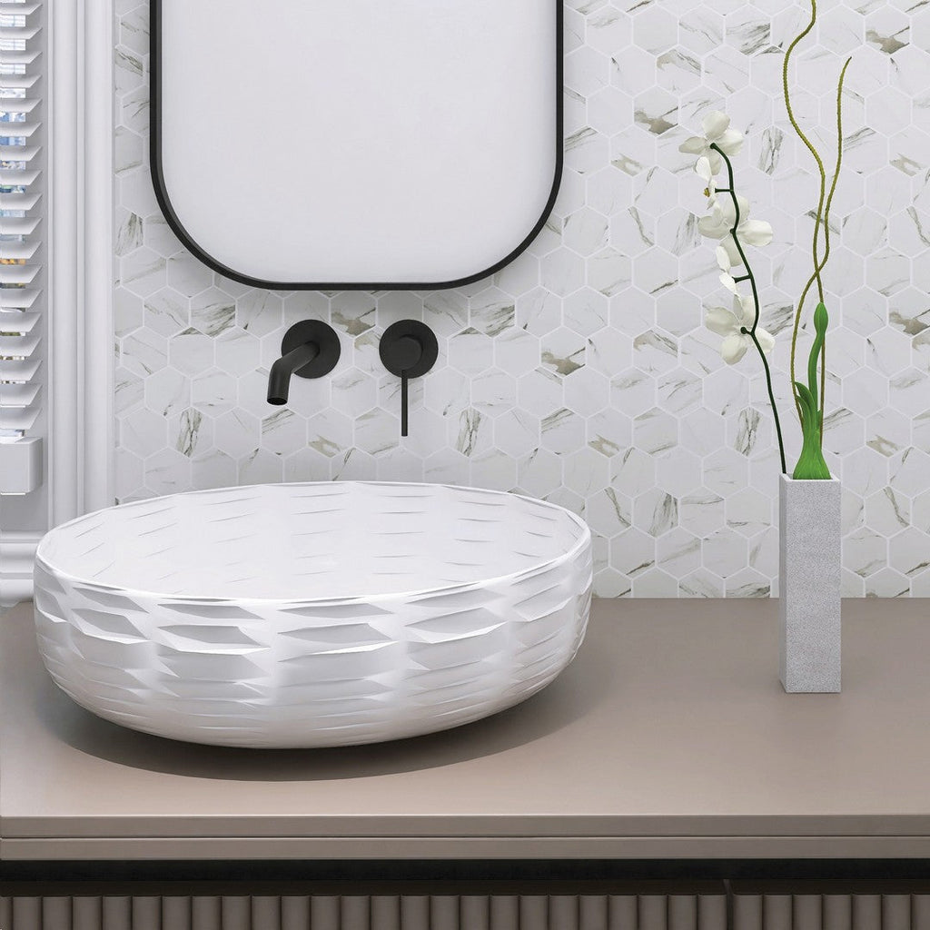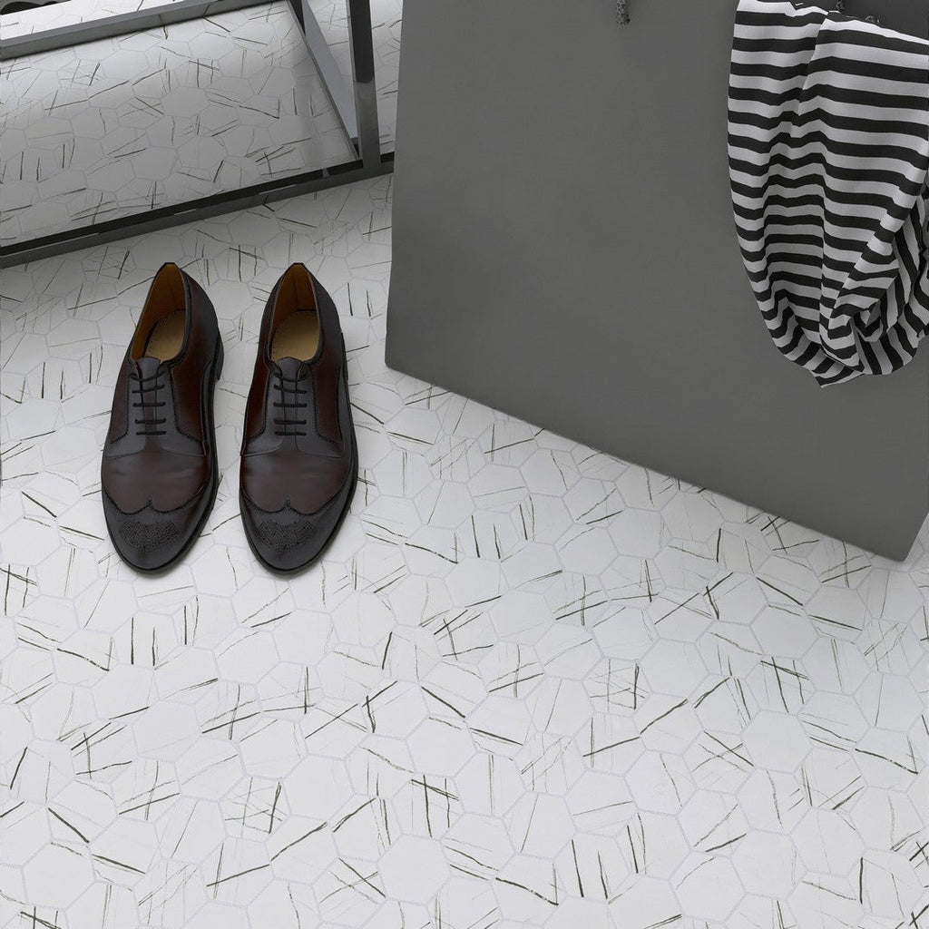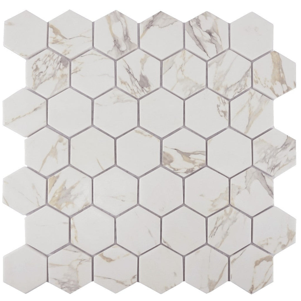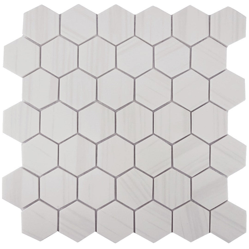 Tesoro Native 11.75" x 12" Matte 2" Hexagon Glass Mosaic provides a modern geometric flair with its popular hexagon shape and smooth matte finish. The 11.75" x 12" sheet with 2" hexagon glass pieces in the Native series is a chic choice for feature walls, showers, or kitchen backsplashes, combining trend with durability.