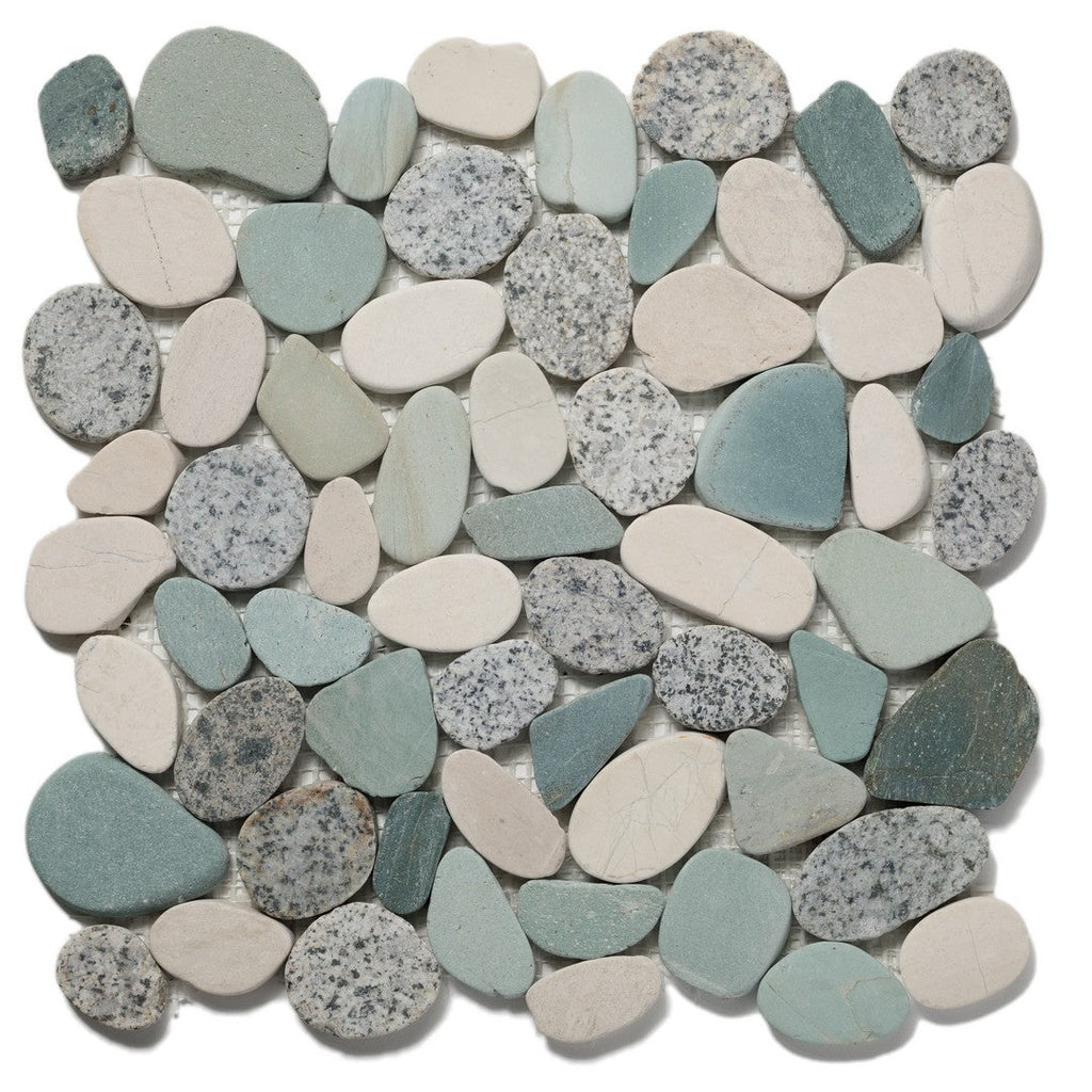 Tesoro Ocean Stones 11.25" x 11.25" Interlocking Natural Stone Sliced Mosaic: For a contemporary, flat surface with organic texture, choose the Tesoro Ocean Stones 11.25" x 11.25" Interlocking Natural Stone Sliced Mosaic. These flat-faced, sliced natural stones offer a cleaner look than full pebbles while retaining a beautiful variation in tone, ideal for modern stone wall mosaic applications.