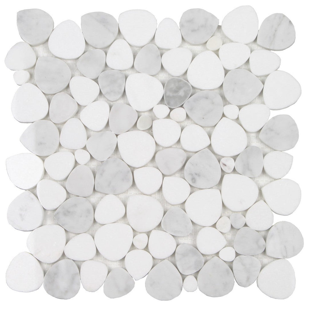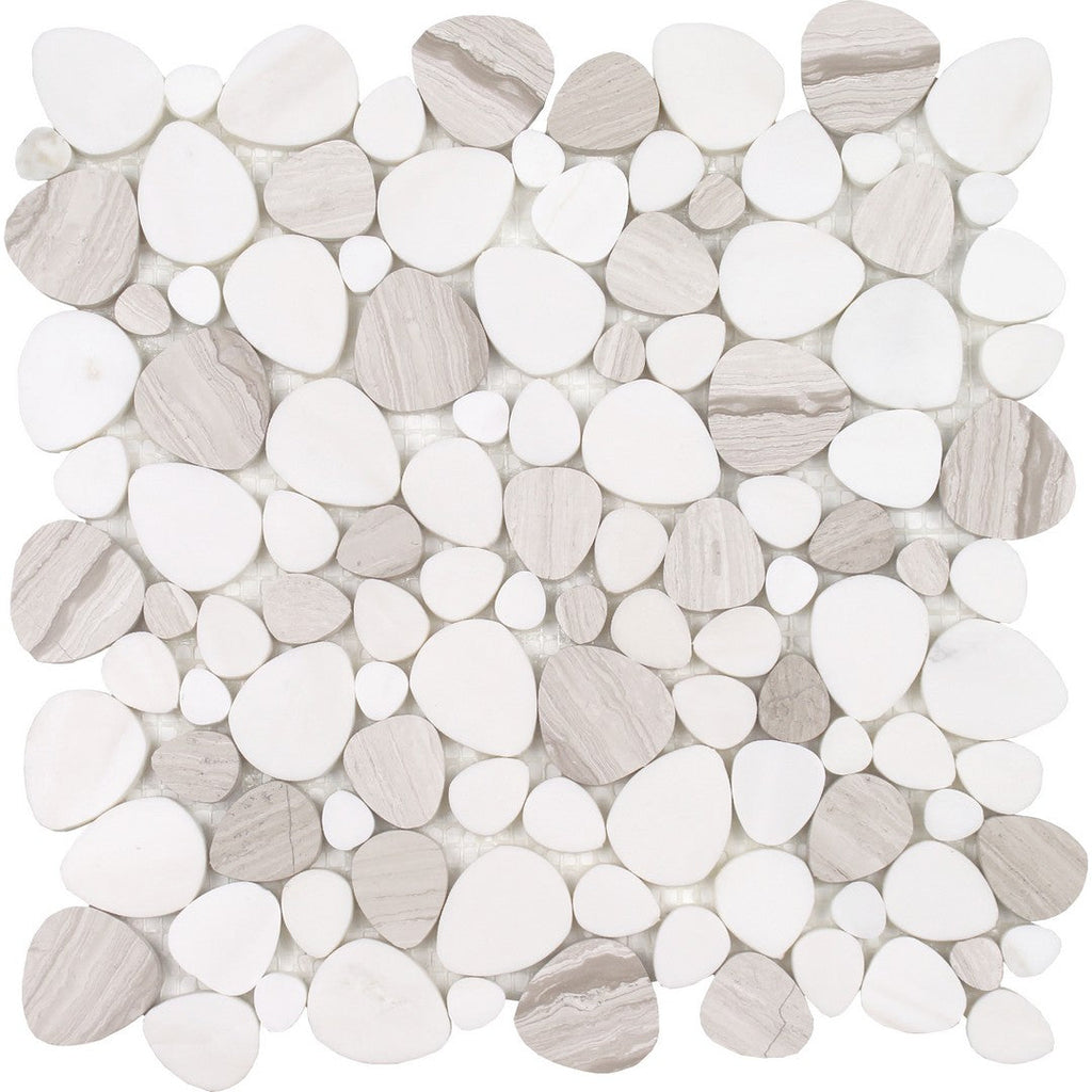Tesoro Ocean Stones 11.75" x 12" Polished Interlocking Natural Stone Sliced Mosaic: For a refined, lustrous natural stone look, consider the Tesoro Ocean Stones 11.75" x 12" Polished Interlocking Natural Stone Sliced Mosaic. The polished finish on the flat, sliced stones enhances their innate beauty, making this a luxurious choice for a high-impact polished natural stone accent.