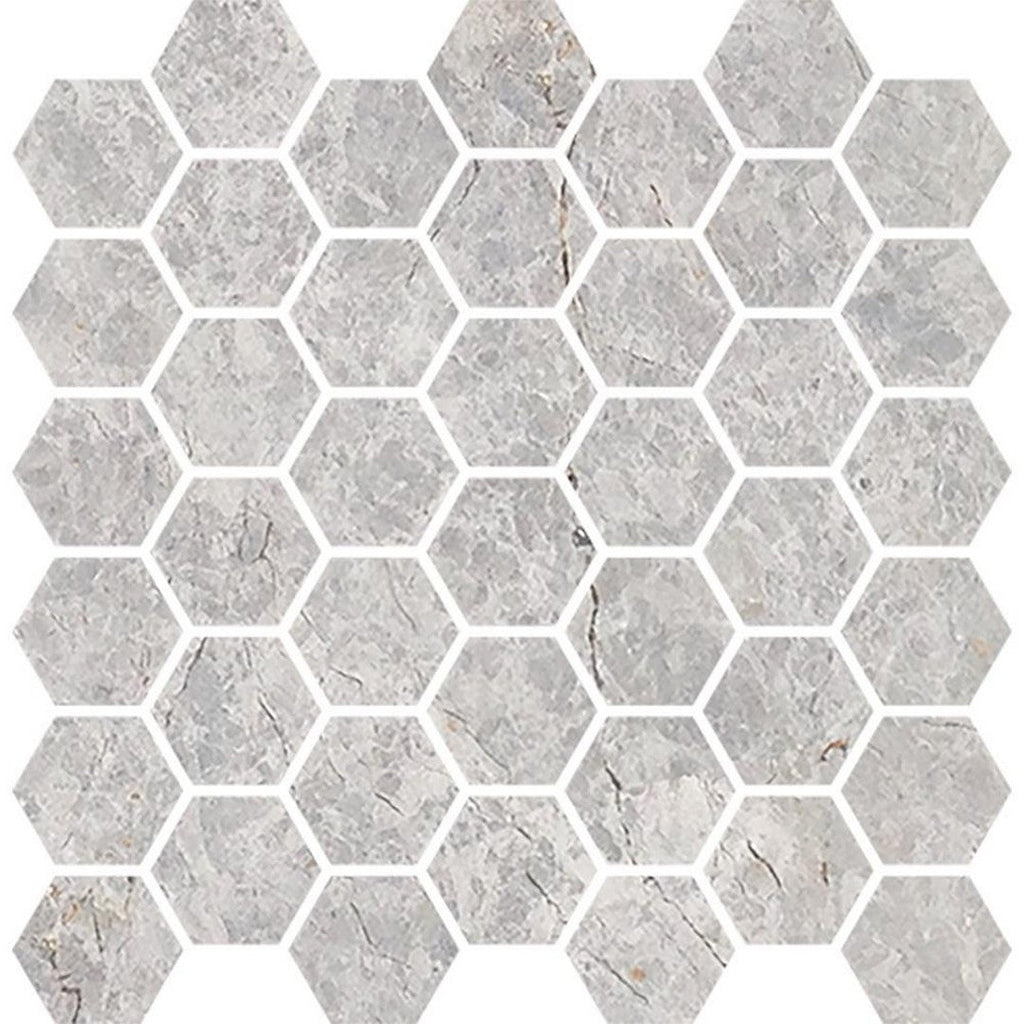 Tesoro Pietra Antica Antiqued Stones 11.75" x 11.875" Interlocking Brushed Natural Stone 2" Hexagon Mosaic offers a seamless and stylish geometric pattern. This brushed natural stone mosaic's 2-inch hexagons are ideal for creating a captivating floor or a textured backsplash. The interlocking design ensures easy installation and a cohesive look, while the Tesoro Pietra Antica mosaic's natural beauty adds depth and character to any room.
