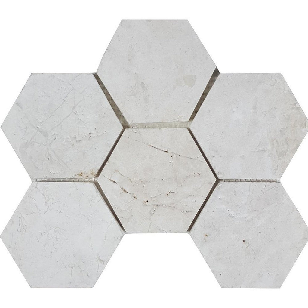 Tesoro Pietra Antica Antiqued Stones 7.75" x 10.25" Interlocking Brushed Natural Stone 4" Hexagon Mosaic offers a bold and modern geometric pattern with a rustic finish. The large 4-inch hexagons of this brushed natural stone mosaic create a striking visual impact on any surface. Perfect for floors, shower walls, or a contemporary backsplash, the Tesoro Pietra Antica mosaic is a durable and stylish option.