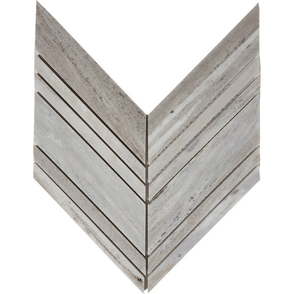 Tesoro Pietra Antica Antiqued Stones 9.375" x 11.875" Interlocking Polished Natural Stone Chevron Mosaic provides a modern, dynamic look with a luxurious finish. This polished natural stone mosaic's chevron pattern creates a sense of movement and sophistication on any wall or floor. The interlocking design ensures a seamless installation, making the Tesoro Pietra Antica mosaic a stunning and durable choice for a high-end, contemporary design.
