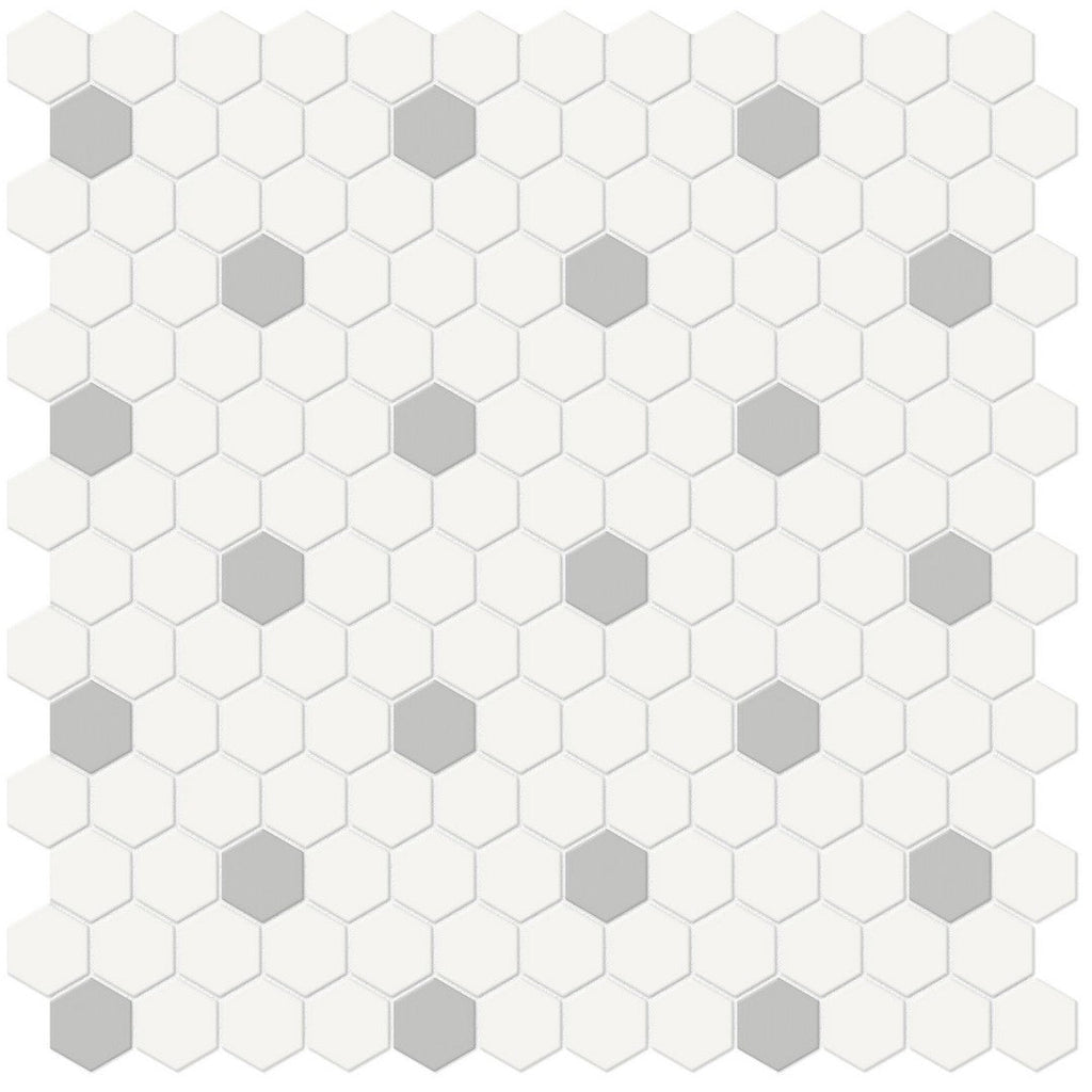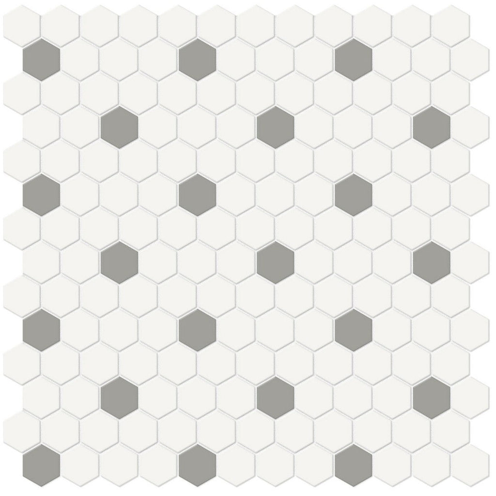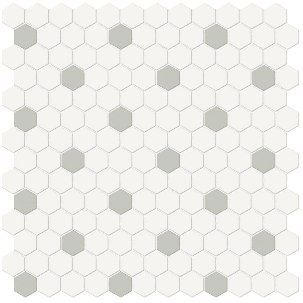 Tesoro Soho 11.75" x 11.5" Pressed Matte Porcelain 1" Hexagon Decorative Mosaic introduces a detailed, eye-catching 1-inch hexagon decorative pattern with a sophisticated matte porcelain finish. This 11.75x11.5 Soho mosaic is expertly designed to be a captivating accent tile for kitchen backsplashes or bathroom walls, blending timeless shape with modern decor.