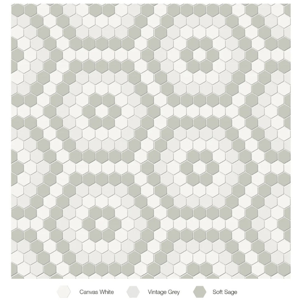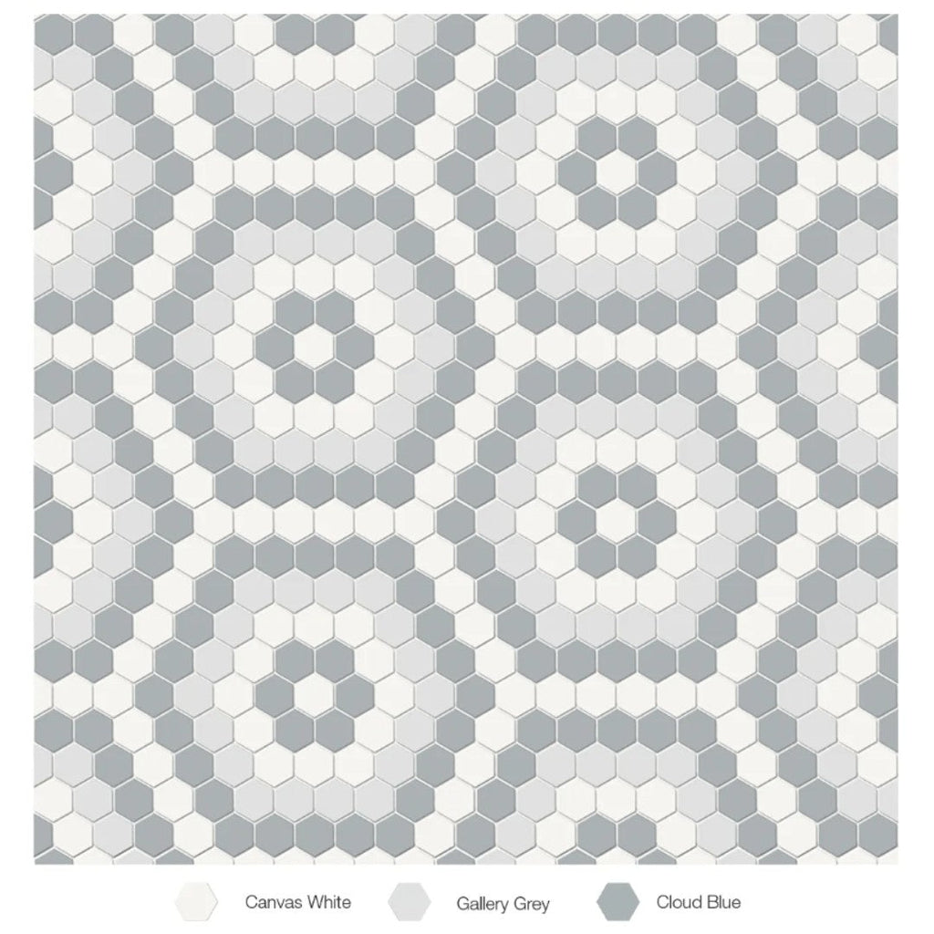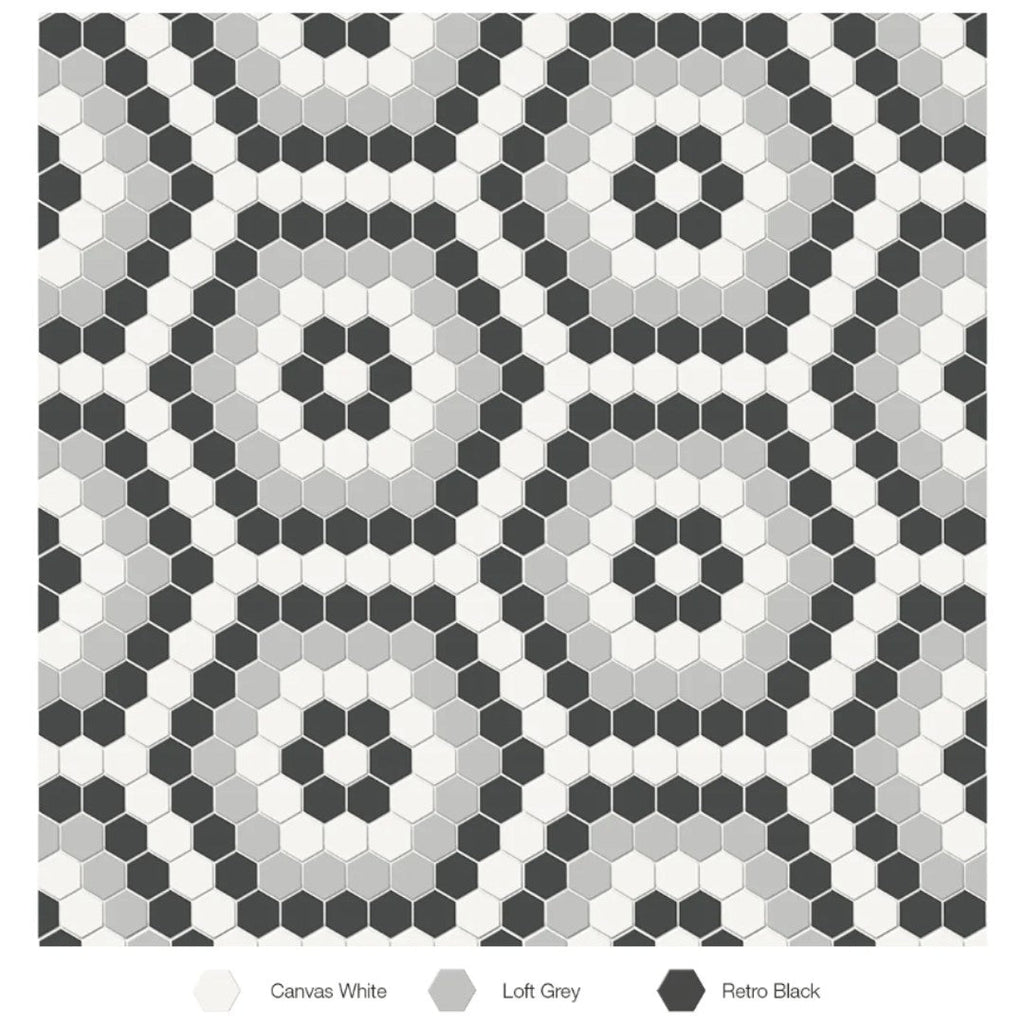 Tesoro Soho 14.50" x 8.25" Pressed Matte Porcelain Hexagon Blend Mosaic showcases an engaging mixture of colors in a popular hexagon blend mosaic style with a durable matte porcelain finish. This 14.50x8.25 Soho sheet is an excellent option for a visually rich floor or wall installation, offering both durability and designer appeal.