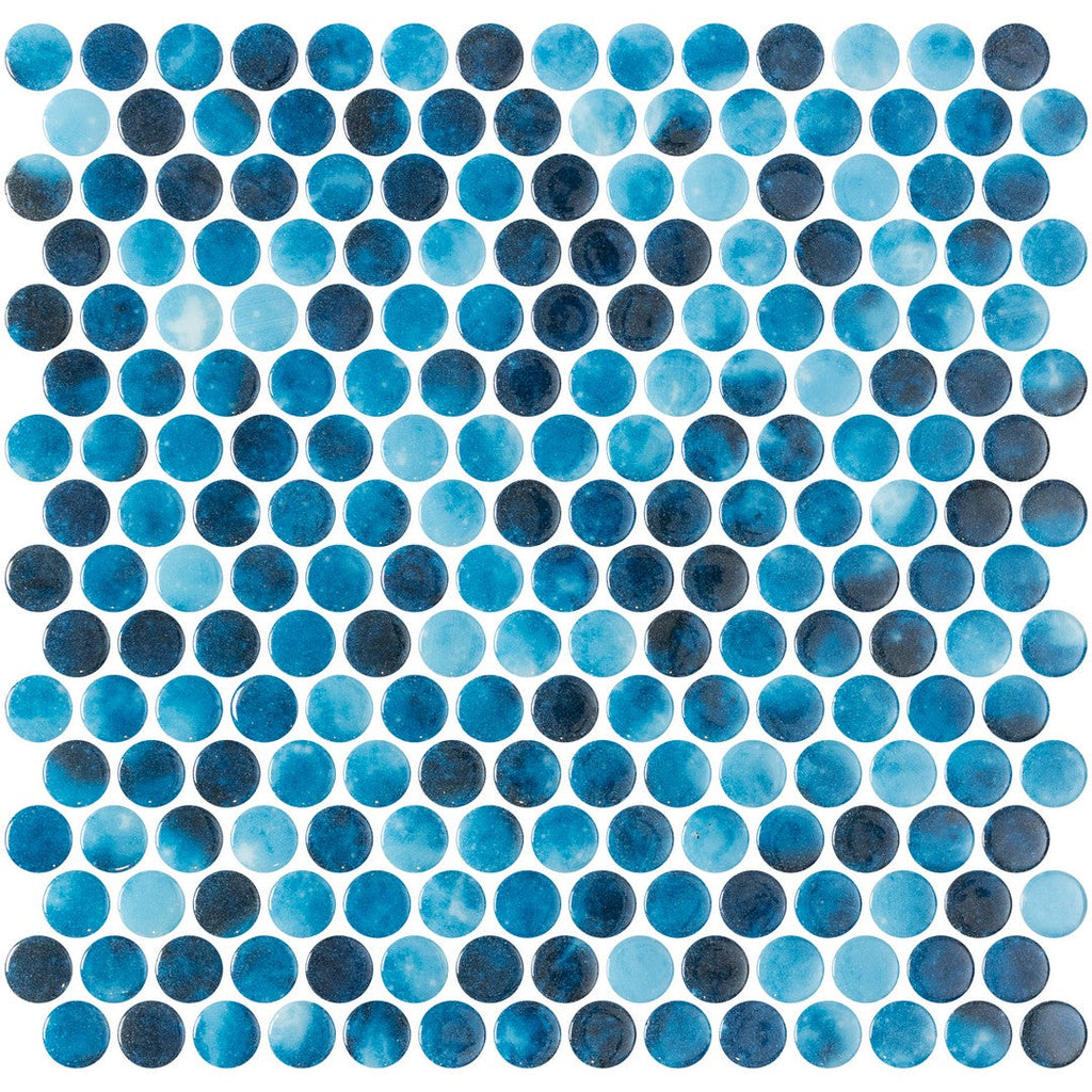 Tesoro Vanguard 11" x 11" Interlocking Penny Round Glass Mosaic features the trendy, small-chip penny round pattern in a reflective glass mosaic. This interlocking glass mosaic is an excellent choice for a playful yet elegant backsplash or feature wall in bathrooms and kitchens.
