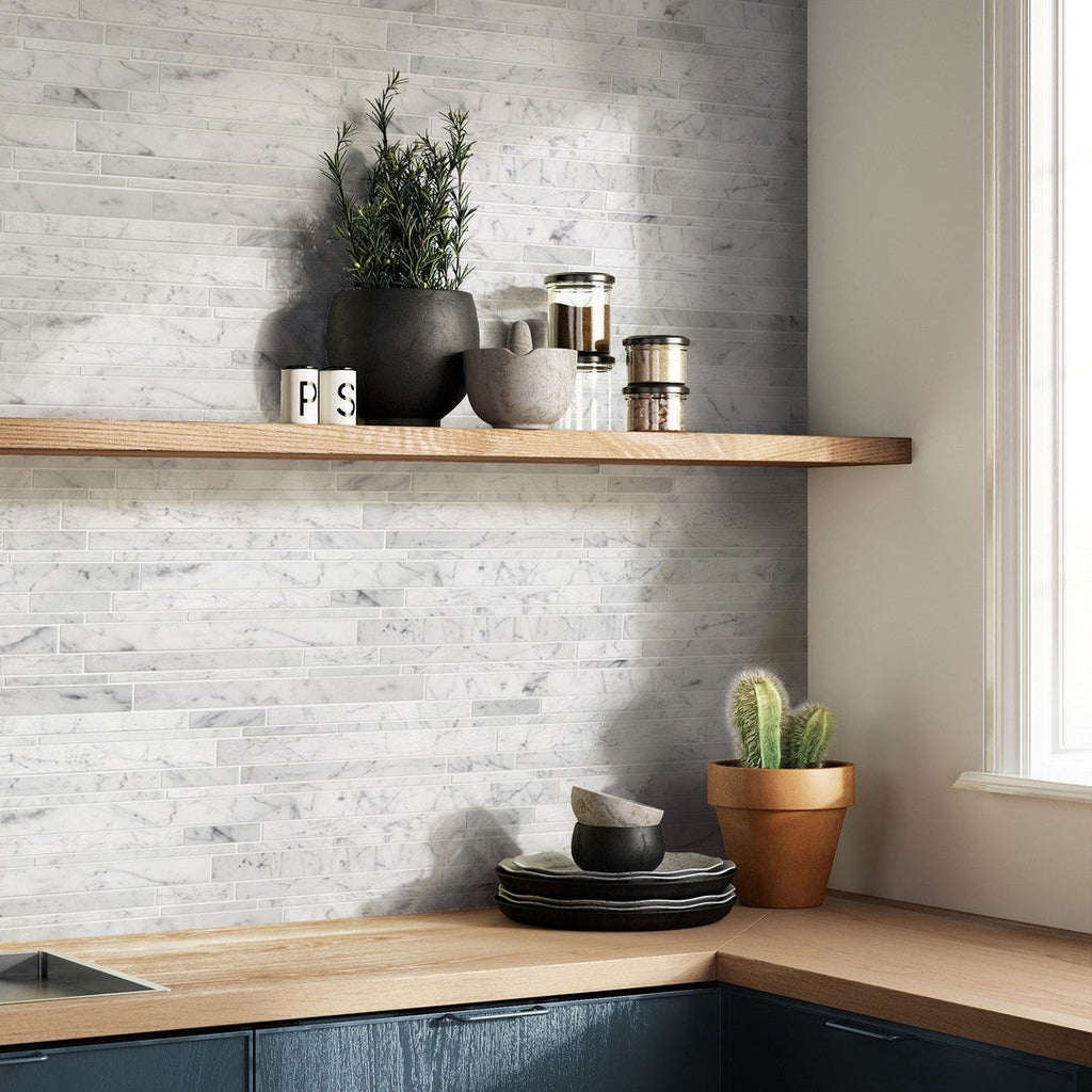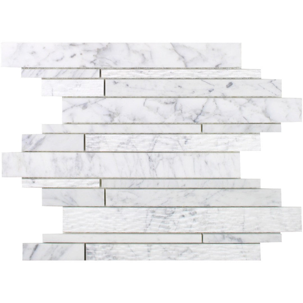 Tesoro Venatino Goia 12" x 10.5" Interlocking Random Linear Natural Stone Mosaic is a beautiful, interlocking mosaic of randomly sized marble strips. This natural stone mosaic is excellent for creating a luxurious, textural linear design on backsplashes and fireplace surrounds, highlighting the unique variation of the Venatino stone.