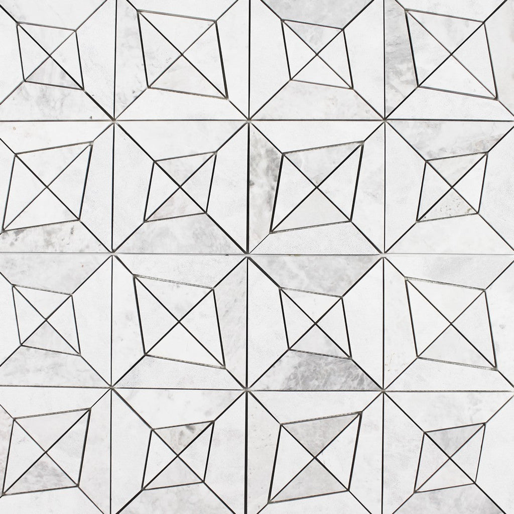 Tesoro Waterjet 12.75" x 12.75" Apollo Polygon Natural Stone Mosaic is a geometric masterpiece, using multiple stone finishes and colors in a bold, large-scale polygon design; invest in the masterful Tesoro Apollo waterjet mosaic.